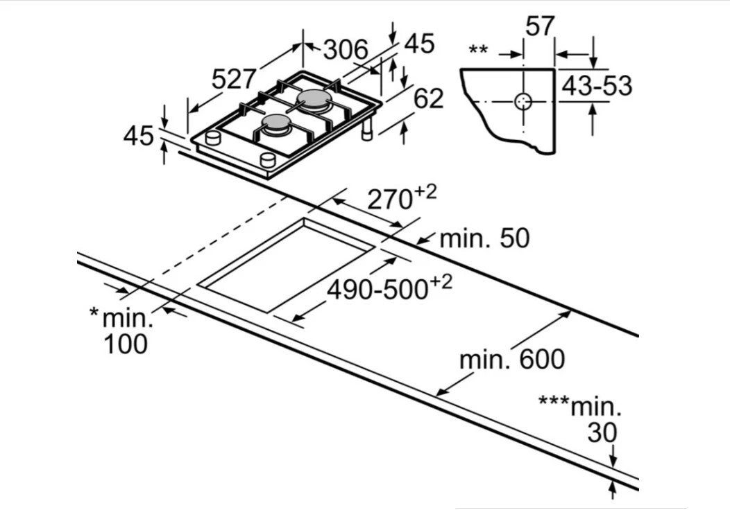 Bếp gas âm Bosch PRA3A6B70 có thiết kế theo hình chữ nhật đứng ( kiểu Domino) rất gọn gàng với kích cỡ 52 x 306 x 527 mm. Sản phẩm được ưa chuộng và phù hợp với các căn hộ có diện tích phòng bếp hạn chế và gia đình ít người.