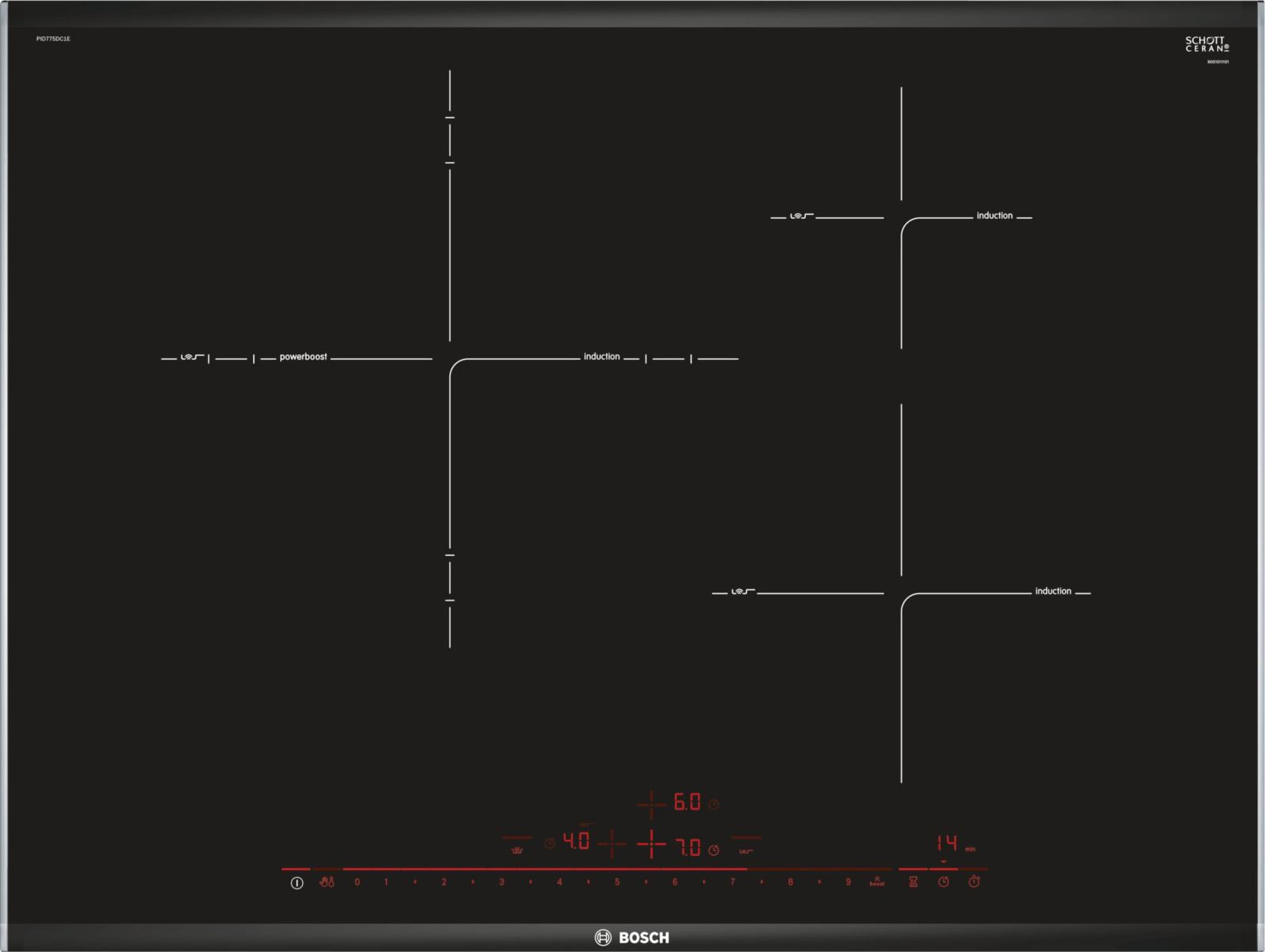 Bếp từ Bosch PID775DC1E với tính năng kiểm soát nhiệt độ dầu ăn: Giúp bạn có món chiên xào chín tới hoàn hảo nhờ cảm biến tự động. Mặt kính của bếp được thiết kế màu đen sang trọng SCHOTT CERAN sản xuất tại Đức - loại gốm kính cao cấp được làm từ gốm sứ thủy tinh đặc biệt có khả năng chịu lực, chịu nhiệt và khả năng va đập tốt.