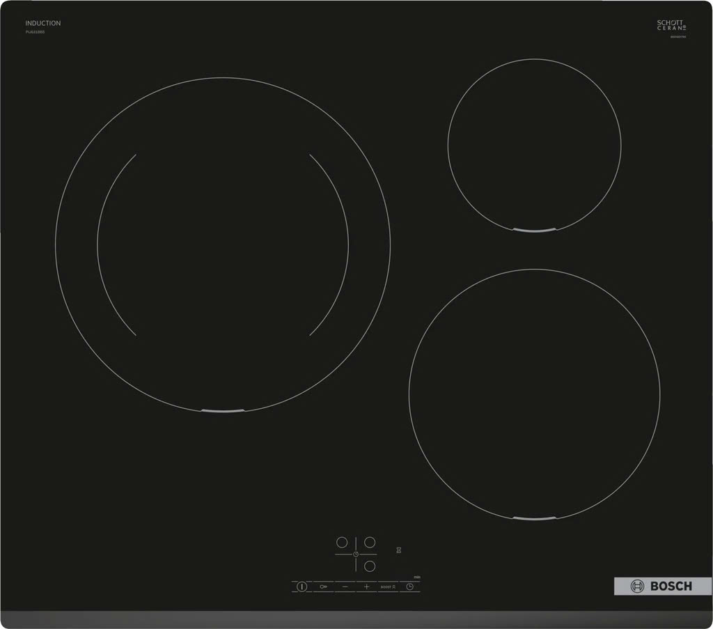 Bếp từ Bosch PIJ631BB5E Serie 4 có thiết kế 3 vùng nấu cảm ứng từ với các công suất khác nhau:
