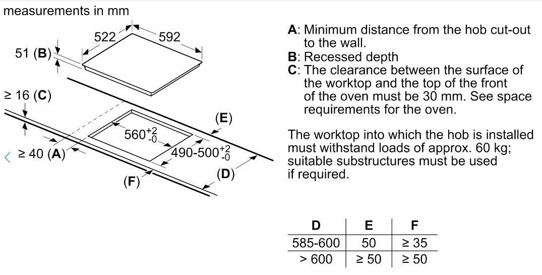 Kích thước của bếp từ Bosch PWP611BB5E là 51 x 592 x 522 mm (CxRxS) với tổng trọng lượng chỉ 10,3kg.