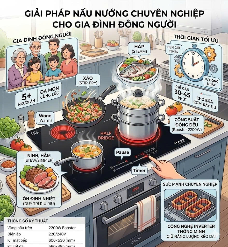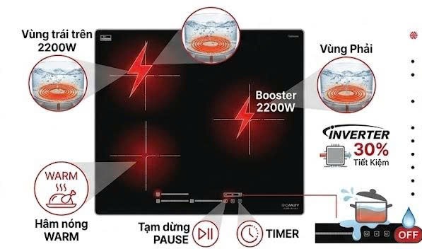 Công nghệ Inverter thông minh: Giúp tiết kiệm tới 30% điện năng. Công nghệ này cho phép bếp duy trì nhiệt độ ổn định, nấu ở mức nhiệt thấp (liu riu) mà không bị đóng ngắt quãng, cực kỳ phù hợp cho món ninh, hầm.