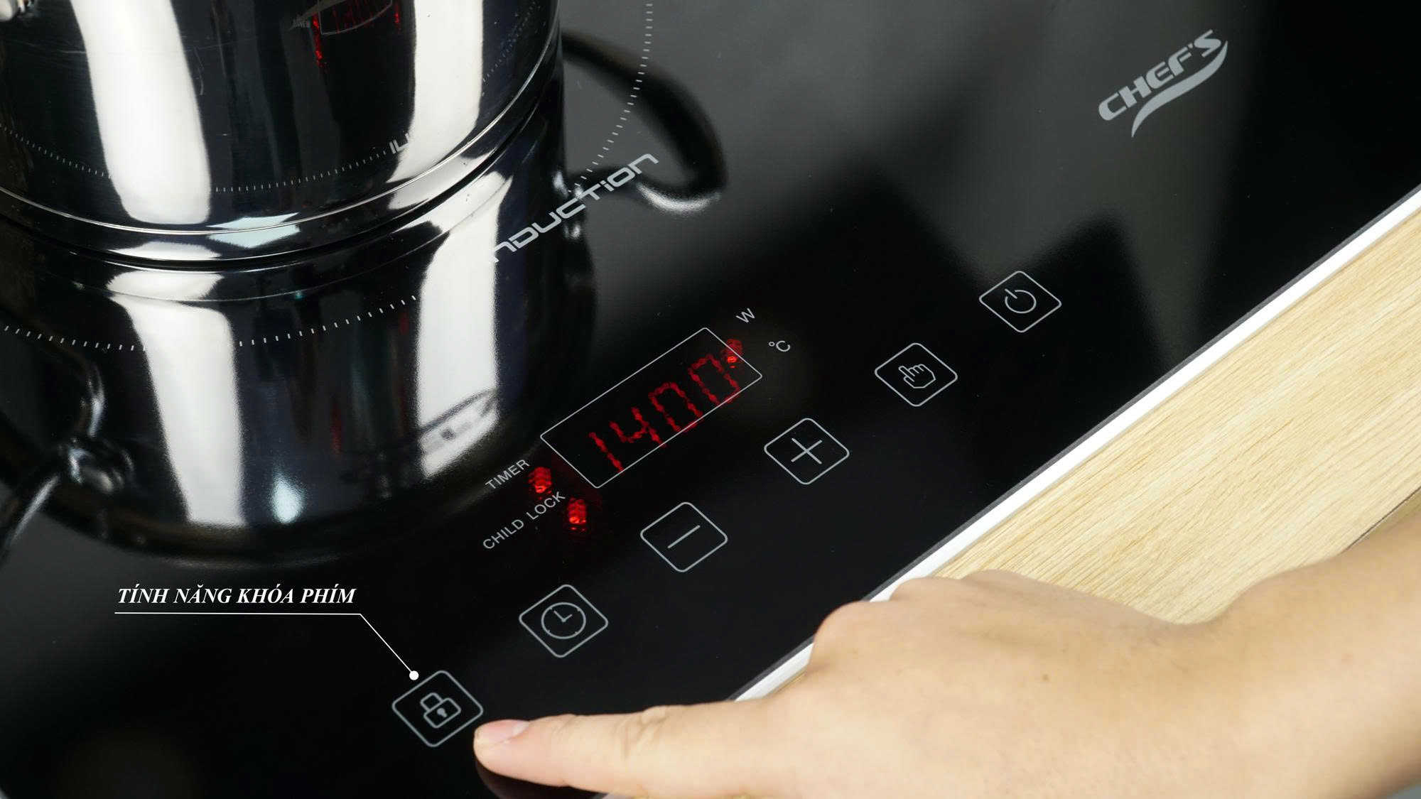 Khóa an toàn Child Lock: Nhấn vào phím khóa 3s để kích hoạt tính năng khóa. Lúc này, các phím trên bếp sẽ bị vô hiệu hóa (chỉ mở nút nguồn và Khóa), người khác, đặc biệt là trẻ em khi vô tình chạm vào bàn phím bếp cũng sẽ không làm thay đổi các chương trình nấu đã được cài đặt. Giữ vào phím khóa 3s để mở lại.