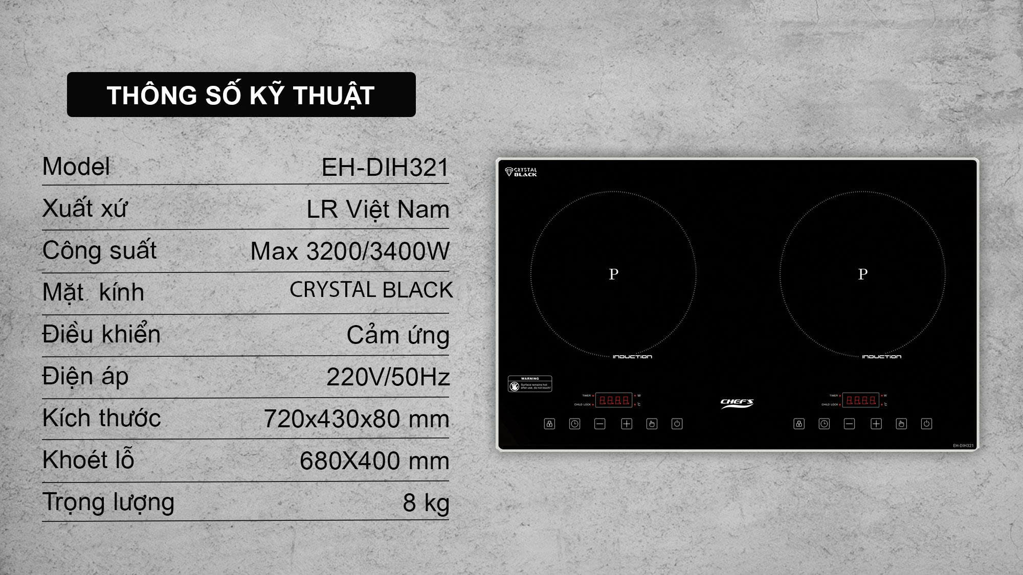 EH-DIH321 là dòng bếp từ đôi thuộc Serie model 321 thương hiệu Chef’s. Bếp có thể lắp đặt âm hoặc để nổi, kích thước 720x430x80 (mm), phù hợp với đa dạng không gian bếp và nhu cầu sử dụng của khách hàng.