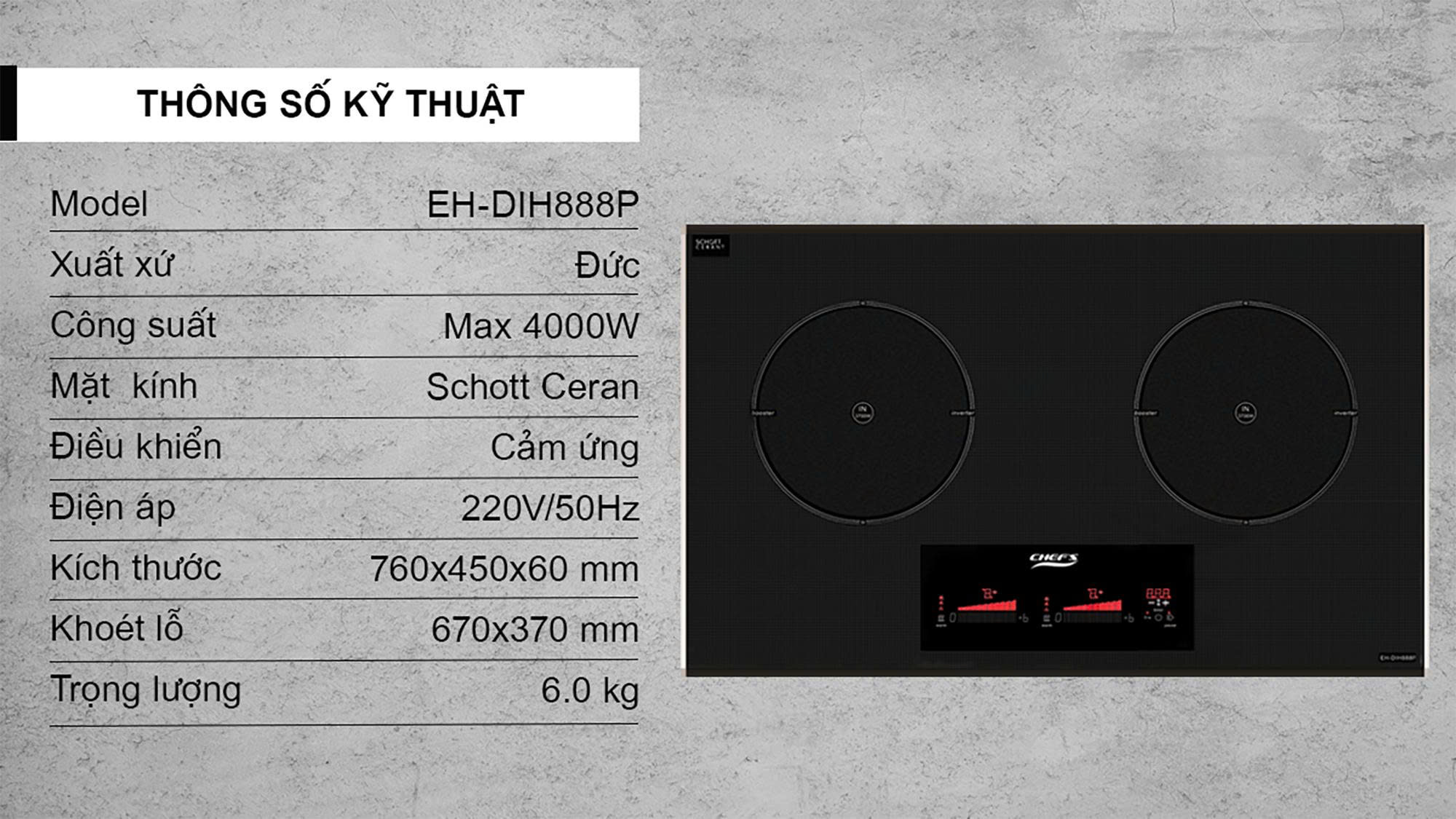 Bếp từ Chef's EH-DIH888P là dòng bếp từ đôi thuộc serie 8 thương hiệu Chef's. Bếp có xuất xứ từ Đức với thiết kế sang trọng, hiện đại theo phong cách Châu Âu. Ứng dụng công nghệ Inverter thông minh vượt trội, tiết kiệm năng lượng tới 30% so với các loại bếp khác