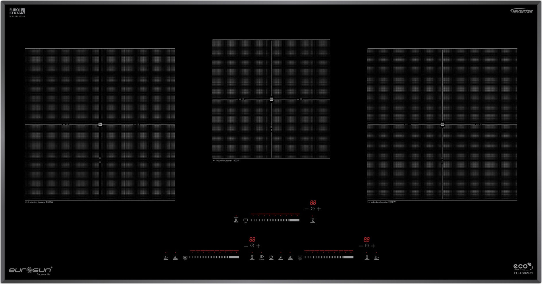 Bảo vệ quá nhiệt (cảm biến nhiệt độ tích hợp trong từng vùng nấu): Bếp Eurosun EU-T386Maxđược thiết kế cảm biến nhiệt độ dưới mỗi vùng nấu, khi có hiện tượng quá nhiệt (nồi đun bị cạn, cháy…) bếp sẽ chủ động ngắt công suất để đảm bảo an toàn cho thiết bị cũng như đảm bảo không sự cố đáng tiếc xảy ra.