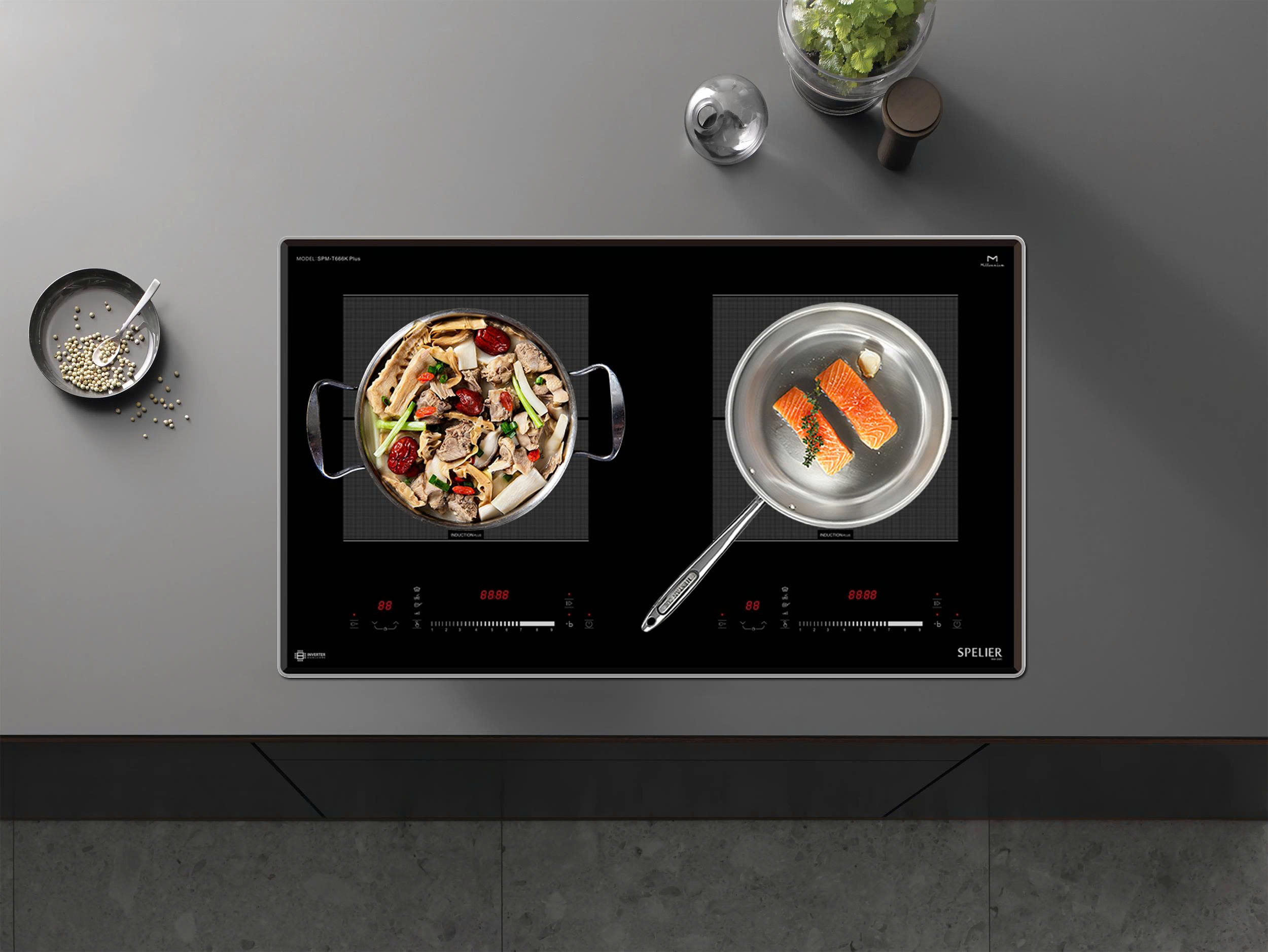 Bếp từ SPELIER SPM T666N với công nghệ Dual Core inverter thông minh vượt trội giúp làm giảm lượng tiêu thụ điện của các sản phẩm có sử dụng lõi từ của bếp từ. Ngoài ra công nghệ Dual Core inverter còn giúp bếp từ điều chỉnh mức công suất phù hợp để không làm tiêu thụ nhiều điện năng. Bếp từ SPELIER SPM T666N với cảm biến thông minh sẽ cố định công suất tiêu thụ điện khi đun nấu, không bật tắt liên tục như các bếp từ thông thường khác (tự động điều chỉnh liên tục để đảm bảo mức nhiệt tương đương bằng với con số hiển thị trên bàn điều khiển).