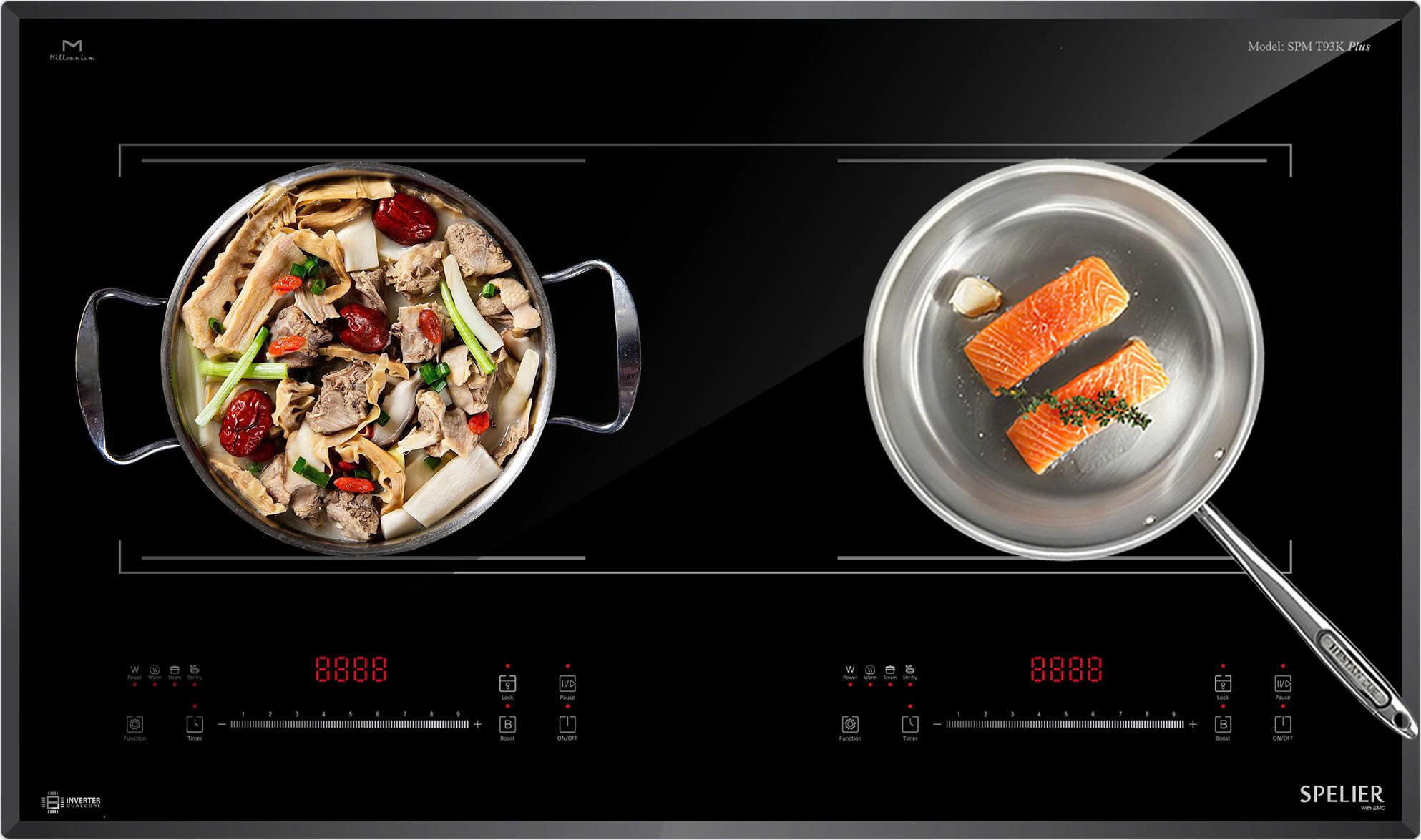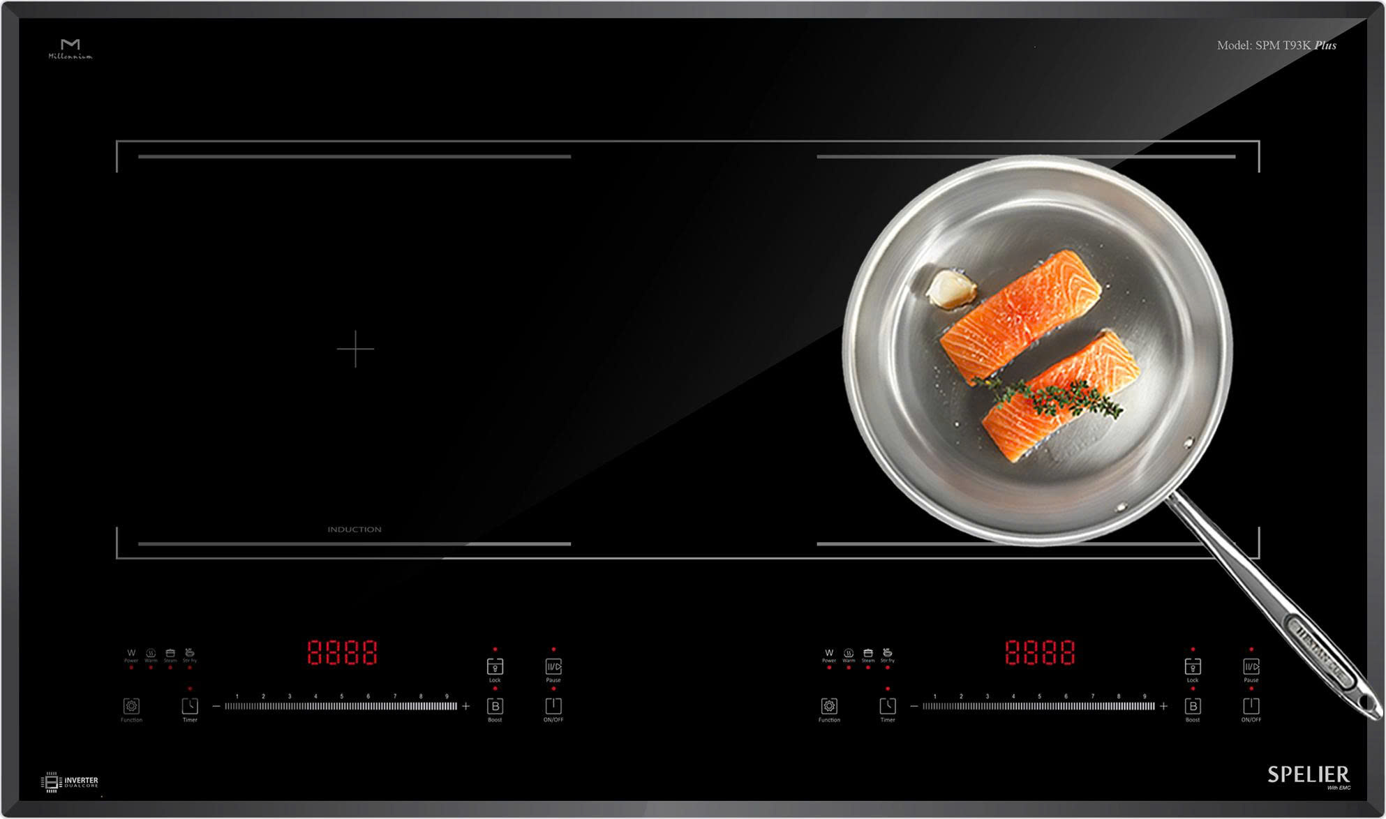 Bếp từ SPELIER SPM T93N với công nghệ Dual Core inverter thông minh vượt trội giúp làm giảm lượng tiêu thụ điện của các sản phẩm có sử dụng lõi từ của bếp từ. Ngoài ra công nghệ Dual Core inverter còn giúp bếp từ điều chỉnh mức công suất phù hợp để không làm tiêu thụ nhiều điện năng. Bếp từ SPELIER SPM T93N với cảm biến thông minh sẽ cố định công suất tiêu thụ điện khi đun nấu, không bật tắt liên tục như các bếp từ thông thường khác (tự động điều chỉnh liên tục để đảm bảo mức nhiệt tương đương bằng với con số hiển thị trên bàn điều khiển).