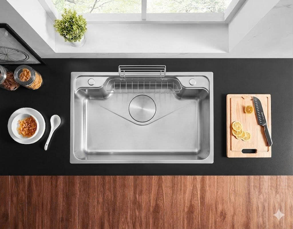Tối ưu không gian hố đơn: Với lòng chậu rộng 800mm, chị có thể thoải mái rửa các loại nồi cơm điện, chảo chống dính cỡ lớn hoặc khay nướng mà không bị vướng víu.