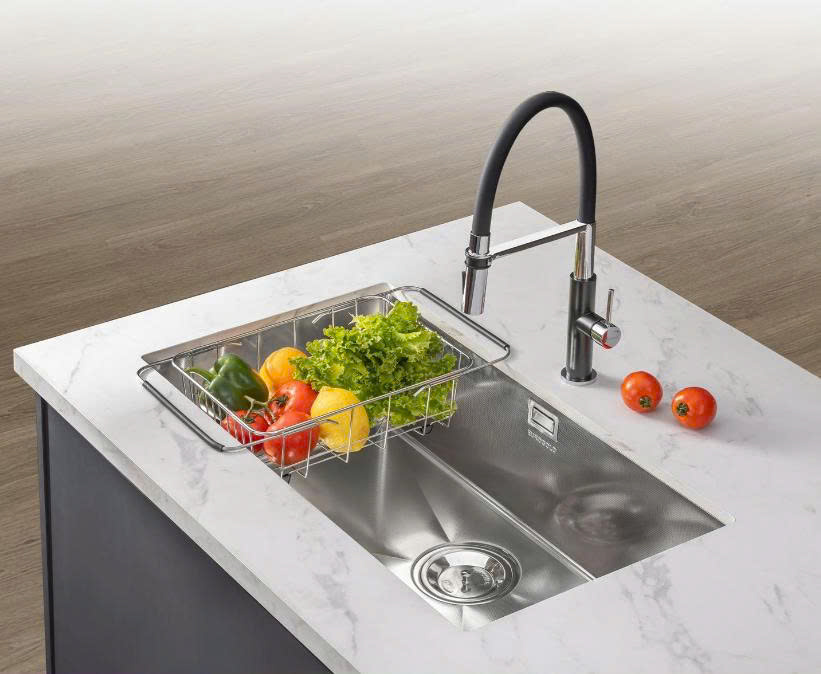 Rổ lỗ Inox cao cấp: Giúp làm ráo thực phẩm, bát đĩa ngay trên lòng chậu, giữ cho khu vực bàn bếp luôn khô thoáng.