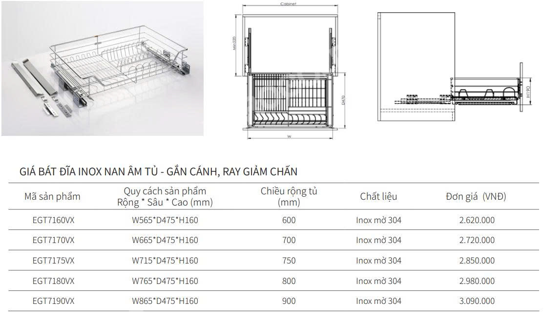 Thông số kỹ thuật giá bát đĩa inox nan âm tủ gắn cánh ray giảm chấn