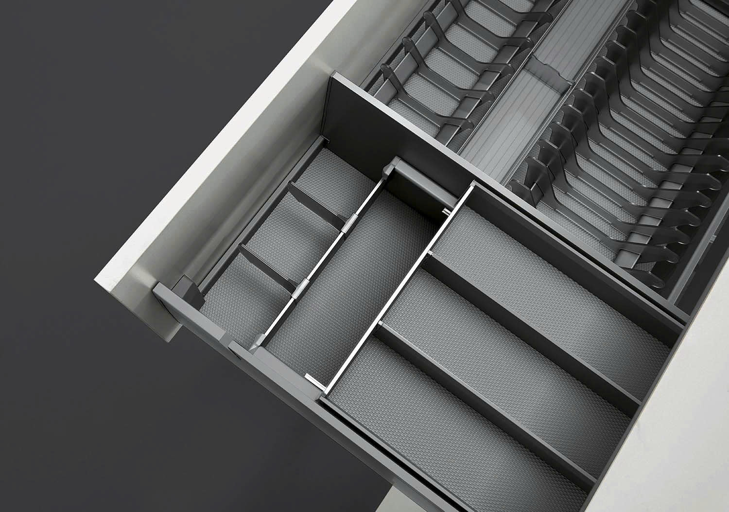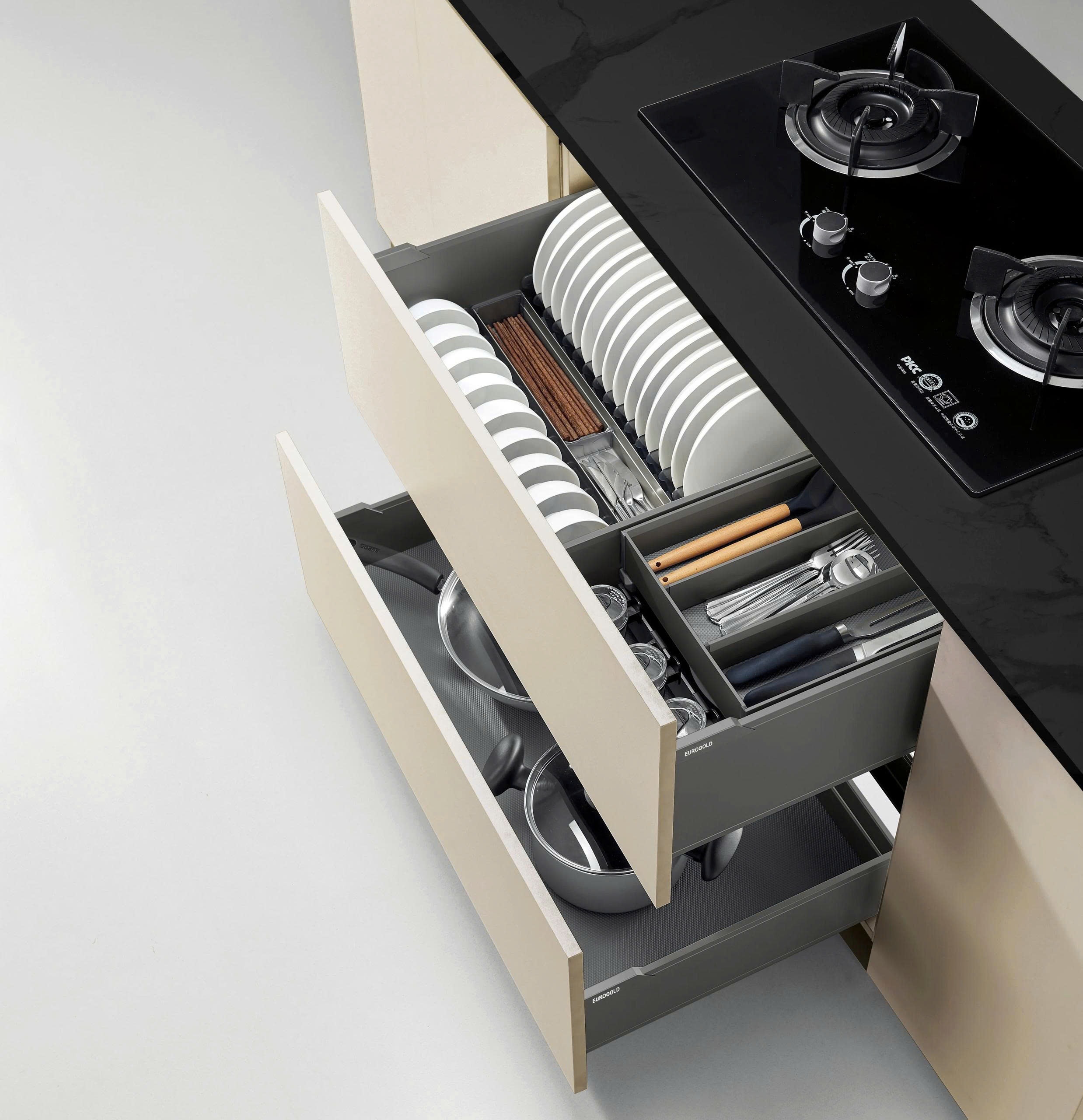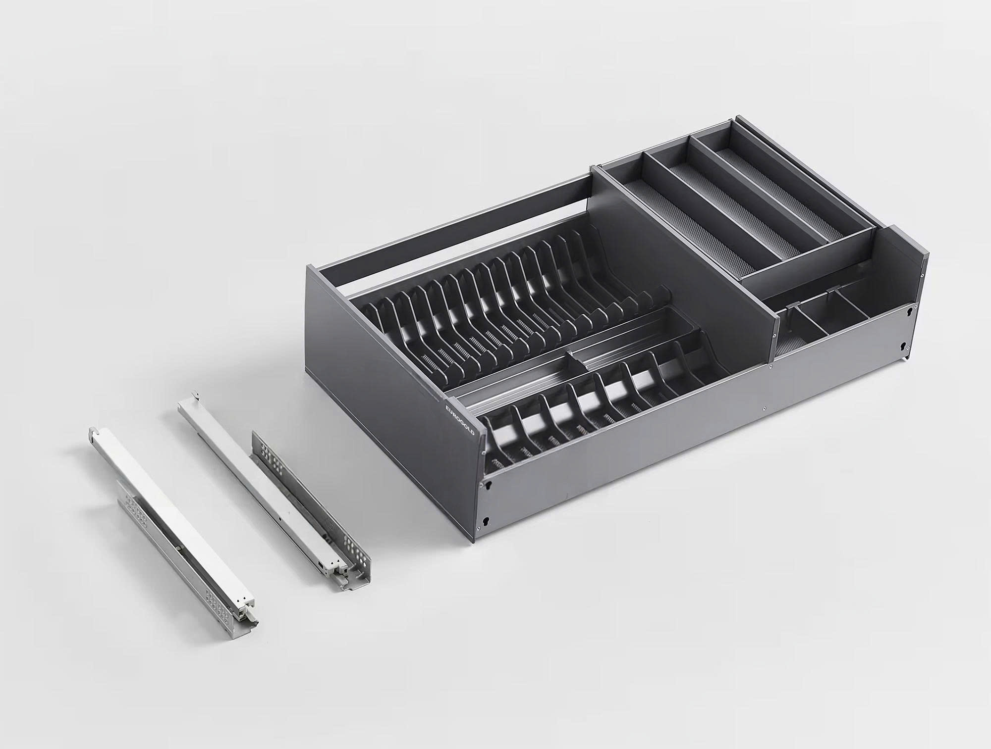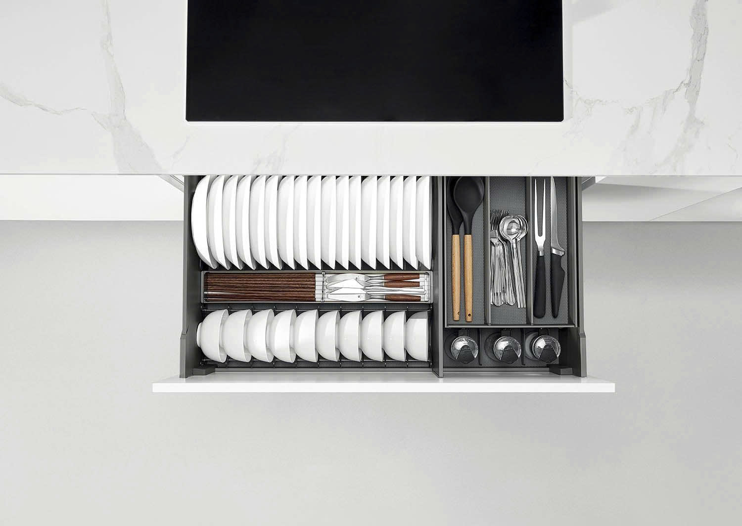 Cấu trúc độc đáo của giỏ kéo ra, có khay đựng dao kéo bên trong dạng trượt, cải thiện tỷ lệ sử dụng không gian. Giá đựng bát đĩa, hộp đựng dao và dĩa có thể di chuyển, tiện lợi và linh hoạt. Cấu trúc lắp đặt nhanh cho cửa tủ, dễ dàng và thuận tiện khi lắp đặt.
