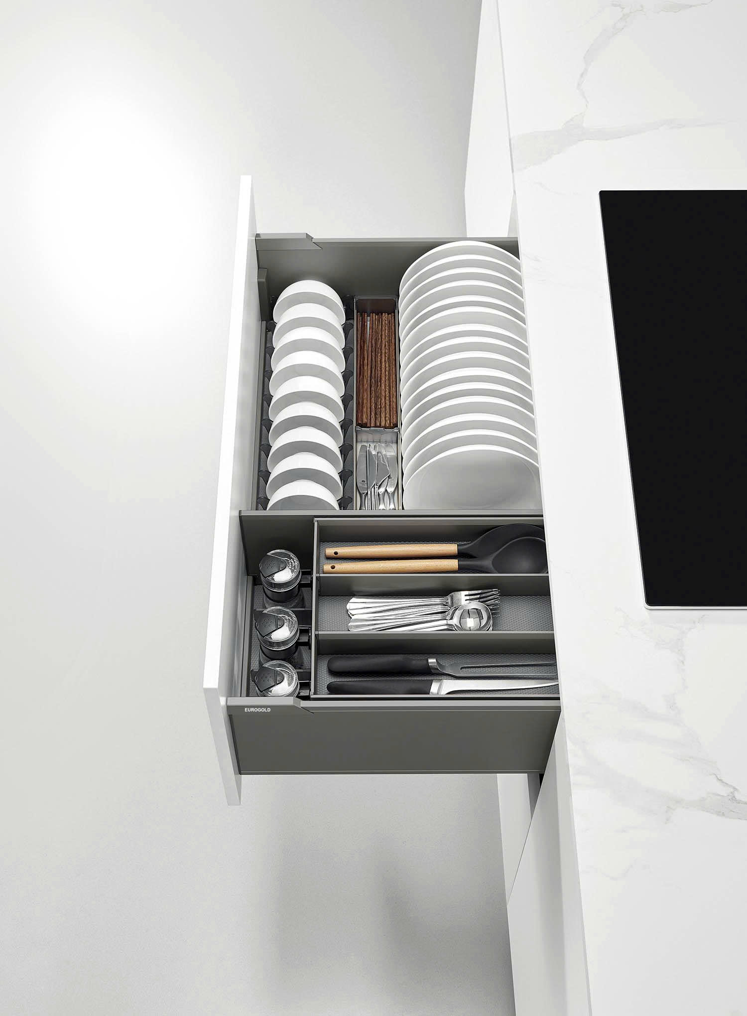 Thiết kế viền mỏng, thể hiện phong cách tối giản và sang trọng nhẹ nhàng, tăng cường khả năng lưu trữ trong bếp. Đáy được phủ thảm chống trượt mang đến vẻ sang trọng, bền bỉ theo thời gian.