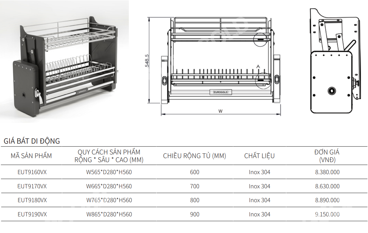 Thông số kích thước giá bát di động – giá úp bát nâng hạ Eurogold