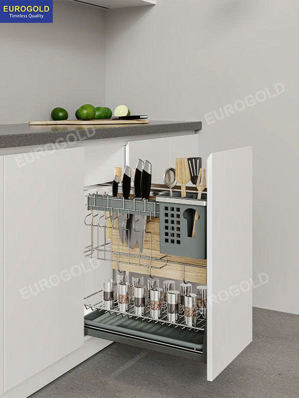 Giá dao thớt nan dẹt inox mờ cao cấp ray giảm chấn Eurogold