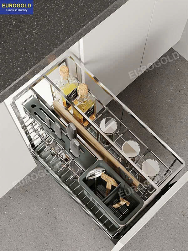 Với thiết kế đơn giản, cấu tạo chắc chắn Giá dao thớt nan dẹt inox mờ ray giảm chấn Eurogold rất dễ dàng lắp đặt. Bạn chỉ cần bắt vít cố định bộ ray trượt giảm chấn của giá với thành và đáy tủ là xong.
