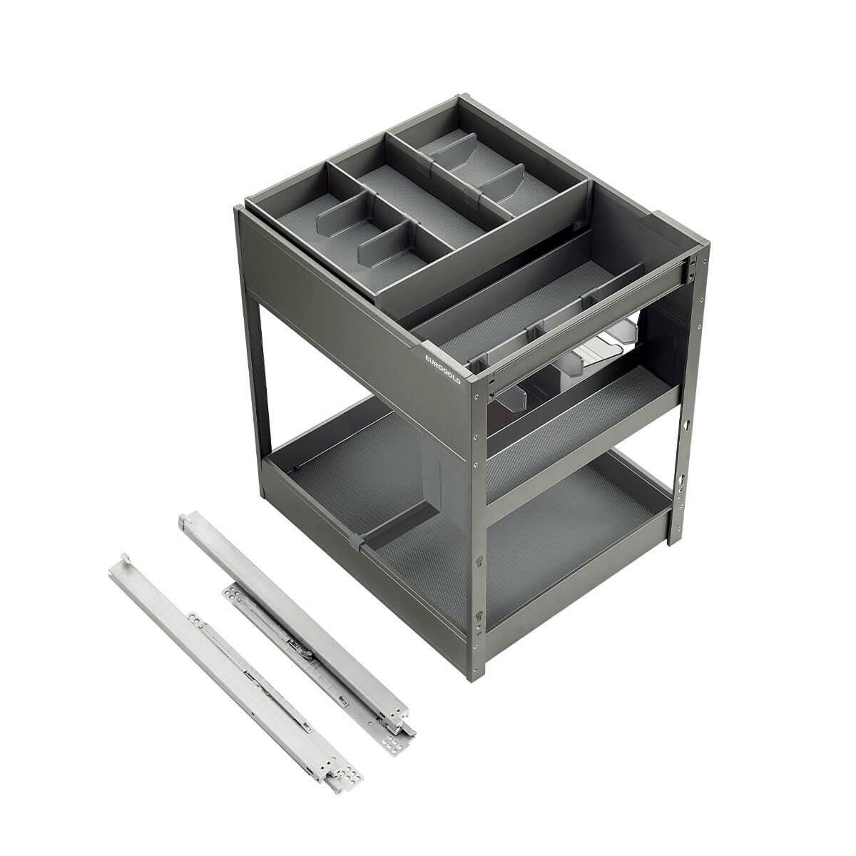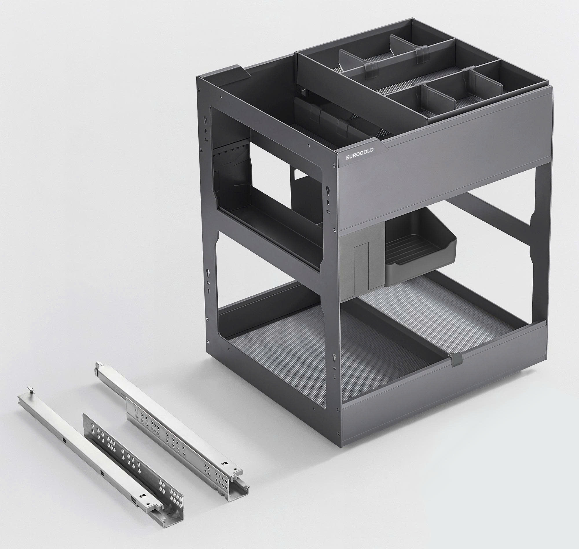 Thiết kế khá nhỏ gọn, giúp bạn tận dụng được tối không gian lưu trữ hệ tủ bếp dưới. Giá gia vị đa năng hợp kim nhôm màu ghi đậm 300mm 350mm 400mm Eurogold EMG5530 | EMG5535 | EMG5540 được thiết kế bao gồm rổ đựng và hệ thống ray trượt giảm chấn. Việc sử dụng giá (kéo ra/ đẩy vào) trở nên êm ái mà vô cùng nhẹ nhàng.