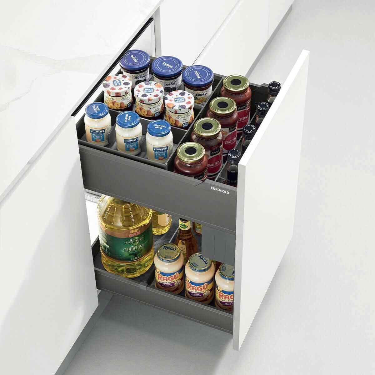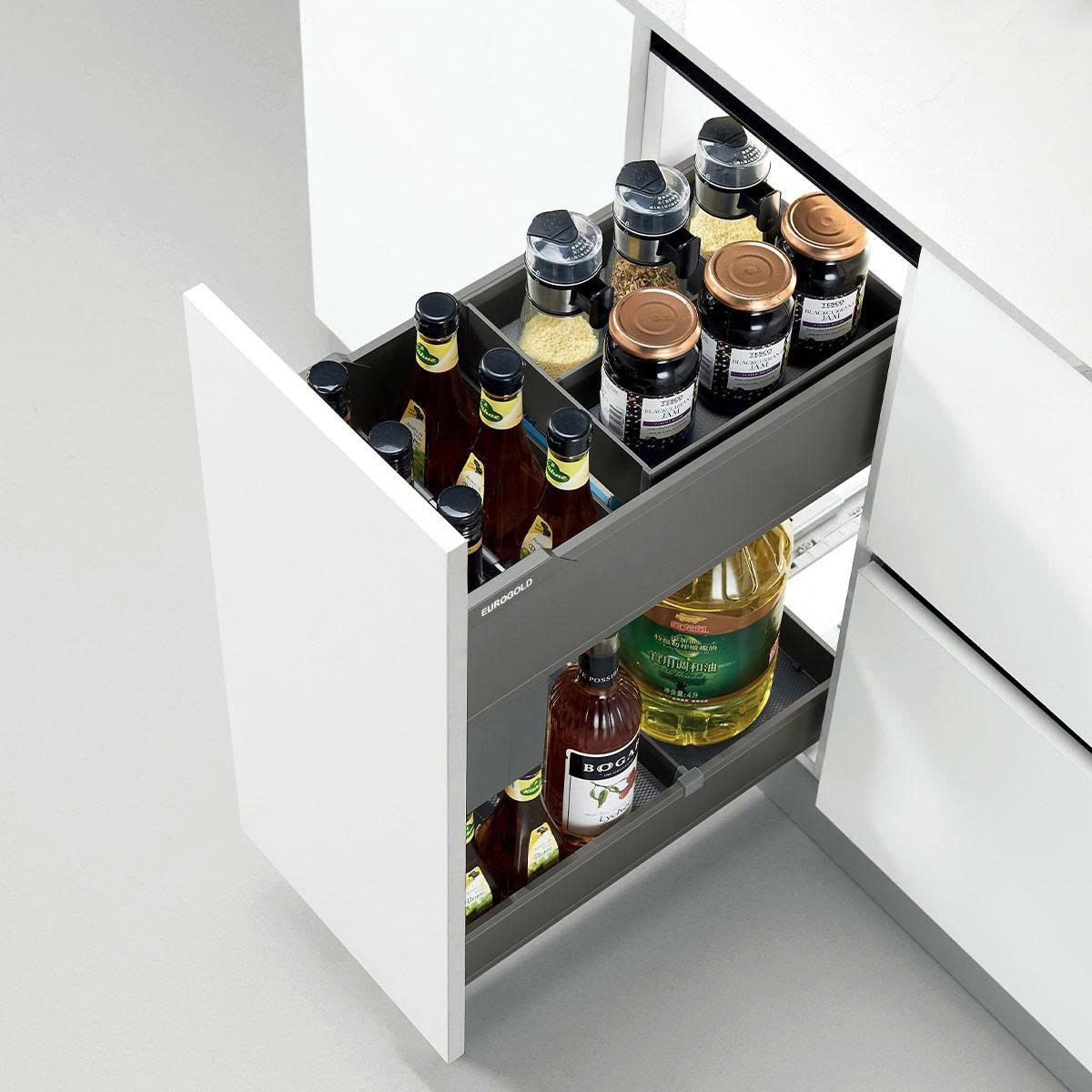 Một căn bếp hiện đại muốn gọn gàng hoàn hảo không thể thiếu các loại phụ kiện tủ bếp hữu dụng như giá gia vị, chai lọ với thiết kế đơn giản, thanh thoát và năng động. Giá gia vị đa năng hợp kim nhôm màu ghi đậm 300mm 350mm 400mm Eurogold EMG5530 | EMG5535 | EMG5540 có thể giúp bạn sắp xếp gọn gàng được gần như toàn bộ các loại chai lọ, gia vị cần thiết cho một gia đình mà không tốn quá nhiều diện tích.
