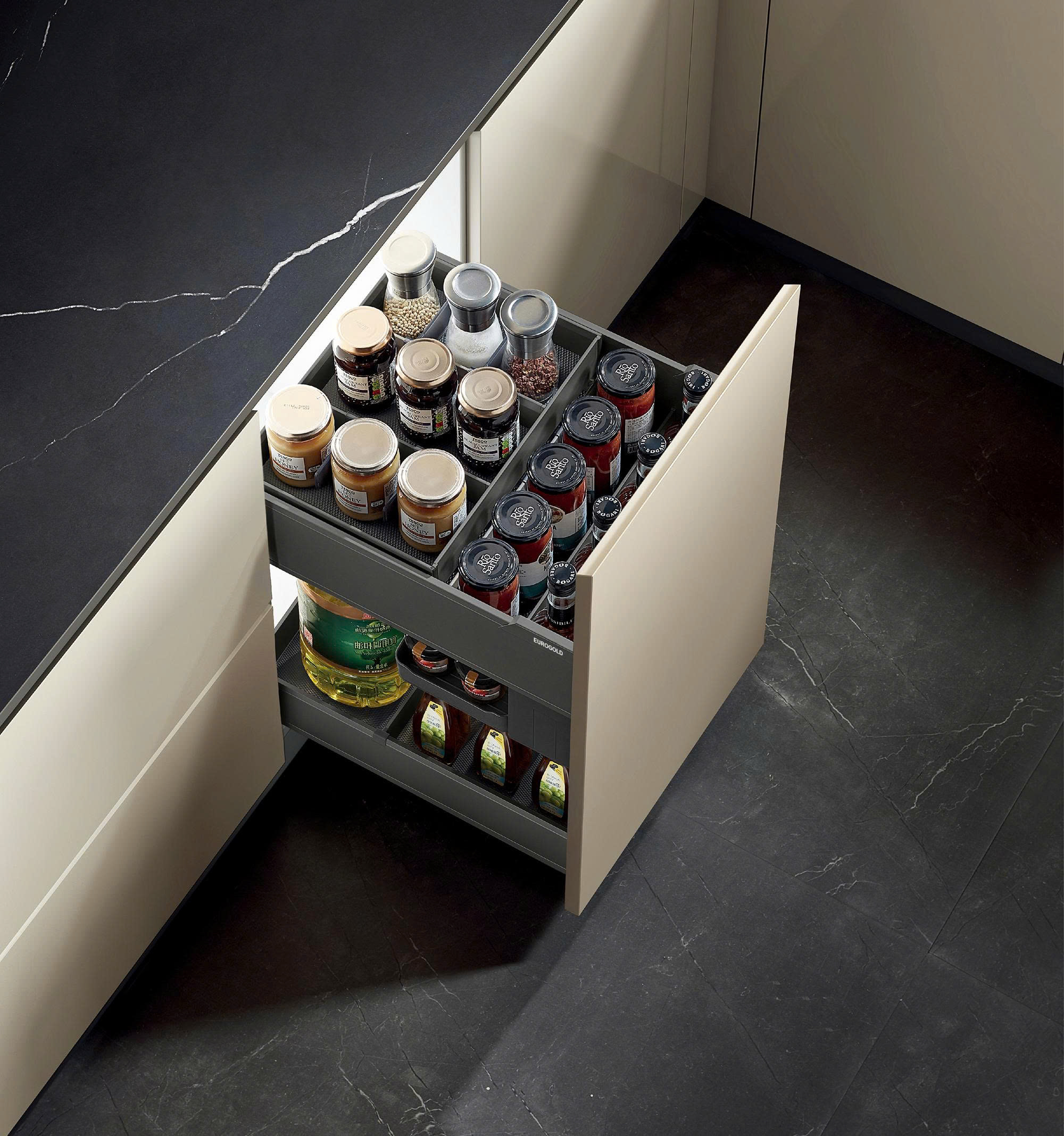Thiết kế viền mỏng, thể hiện phong cách tối giản và sang trọng nhẹ nhàng, tăng cường khả năng lưu trữ trong bếp. Đáy được phủ thảm chống trượt mang đến vẻ sang trọng, bền bỉ theo thời gian.
