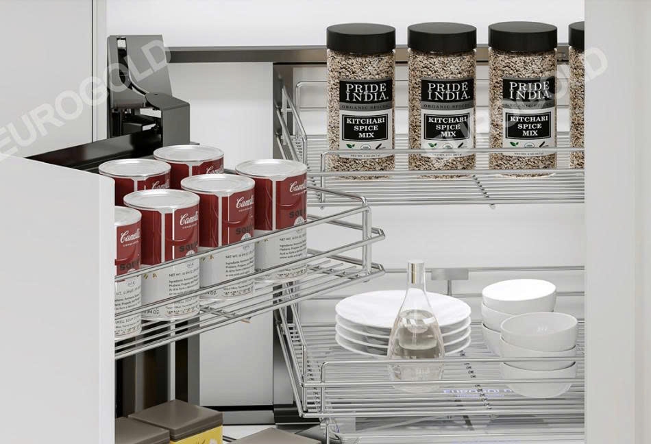 Góc liên hoàn mở trái Inox 304 nan tròn Eurogold ELT101L | ELT102R gồm có 4 khay để đồ thiết kế đa năng tích hợp để được chai lọ, gia vị, nồi chảo.. vào cùng một sản phẩm.