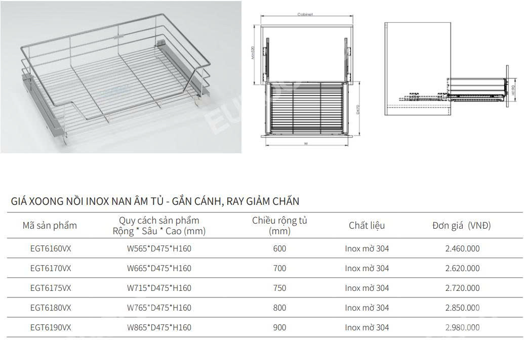 Giá xoong nồi inox nan âm tủ – gắn cánh, ray giảm chấn Eurogold
