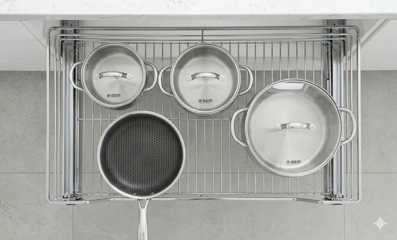 Phân bổ trọng lượng: Xoong nồi thường có trọng lượng lớn, quý khách nên ưu tiên đặt các loại nồi to, nặng ở phía trong và dàn đều sang hai bên để đảm bảo hệ thống ray trượt vận hành cân bằng nhất.