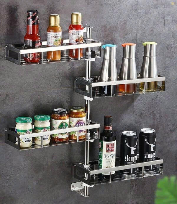 Tùy chỉnh chiều cao tầng kệ: Quý khách có thể linh hoạt điều chỉnh khoảng cách cao/thấp giữa các tầng trên trục đứng để phù hợp với kích thước của các loại chai lọ từ nhỏ (hũ tiêu, muối) đến cao (chai dầu ăn, nước mắm).