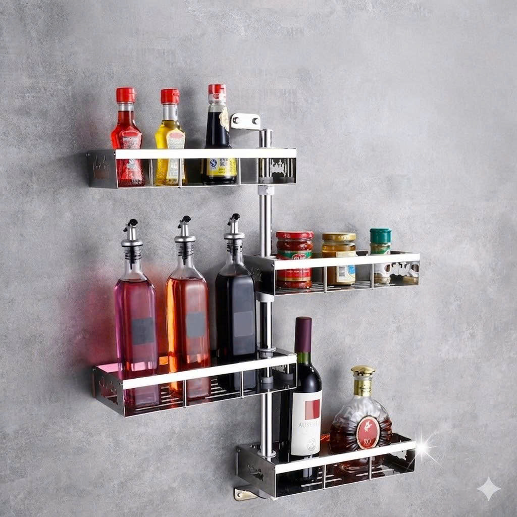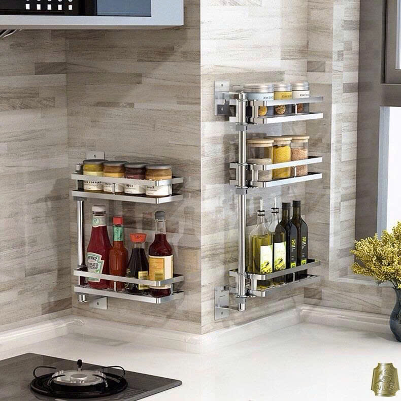Lắp đặt chắc chắn: Hệ thống trục được bắt vít cố định vào tường, đảm bảo khả năng chịu lực cực tốt cho nhiều loại chai lọ gia vị cùng lúc.