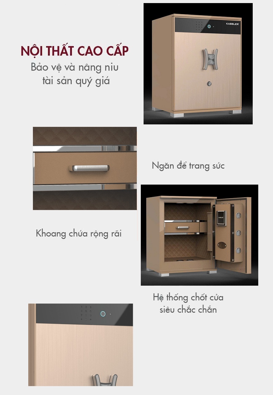 Về Tiện Nghi & Công Nghệ: Hệ thống mở khóa 4 trong 1 và khả năng Kết nối App điện thoại tạo nên sự tiện lợi vượt trội, cho phép quản lý két sắt mọi lúc, mọi nơi.