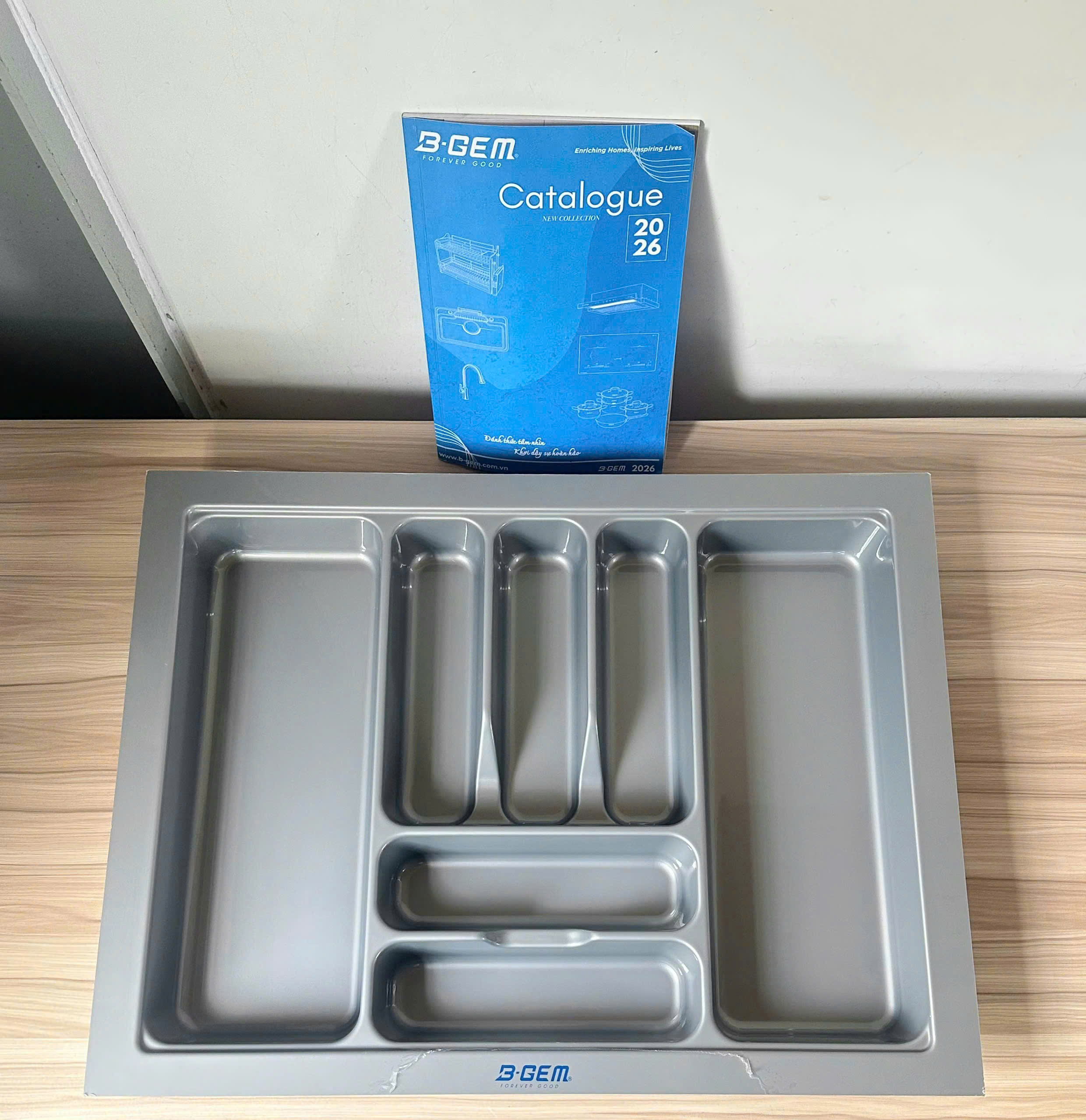 Thiết kế chia ngăn thông minh: Khay được chia thành nhiều ô với kích thước đa dạng (ngắn, dài, rộng khác nhau), phù hợp cho mọi loại dụng cụ từ thìa cà phê nhỏ đến dao kéo hay phới đánh trứng dài.
