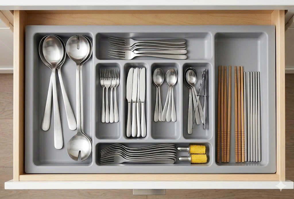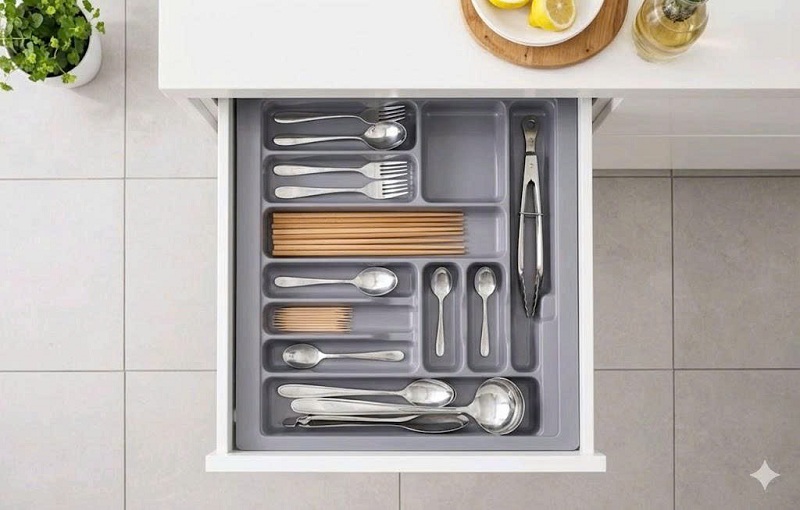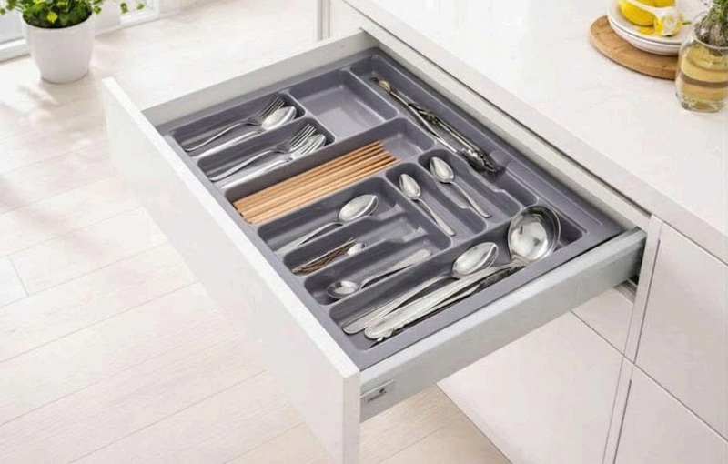 Với dao, thìa, dĩa... ăn hằng ngày chúng ta thường cất giữ chúng ở các giá đựng dành riêng cho các vật đúng đó. Còn đối với những vật dụng ít khi được sử dụng thì sẽ được cất trong các ngăn kéo, nhưng chúng ta không thể để chúng lẫn lộn vào nhau trong cùng một ngăn kéo được, mà sử dụng mỗi sản phẩm vào một ngăn kéo thì rất lãng phí, giải pháp đặt ra ở đây chính là sử dụng phụ kiện tủ bếp khay đựng dao, dĩa và dụng cụ nhà bếp.