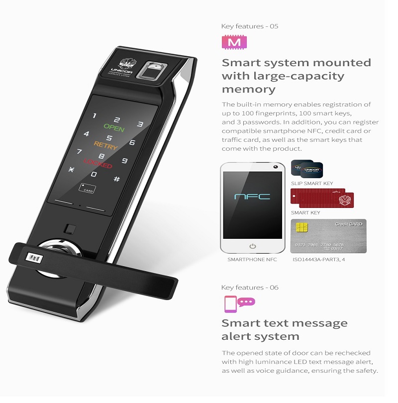 Khóa cửa vân tay Unicor UN-9000BWSK-F có thể đăng ký tôi đa 100 thẻ từ, sử dụng màn hình cảm ứng có đèn LED hiển thị, giúp bạn dễ dàng sử dụng ngay cả khi trời tối. Hiển thị trạng thái : “Open” “Locked” trên màn hình cảm ứng sau khi thao tác (Chú ý: Chỉ những phiên bản quốc tế mới hiển thị ký tự tiếng Anh này)