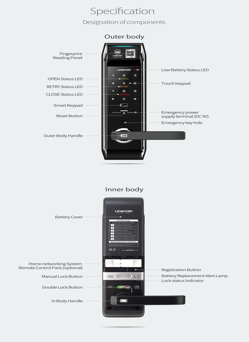 Khóa cửa vân tay UN-9000BWSK-F sử dụng các loại vật liệu chống cháy đặc biệt, bảo vệ cho khóa trước những trường hợp nhiệt độ đột ngột tăng cao