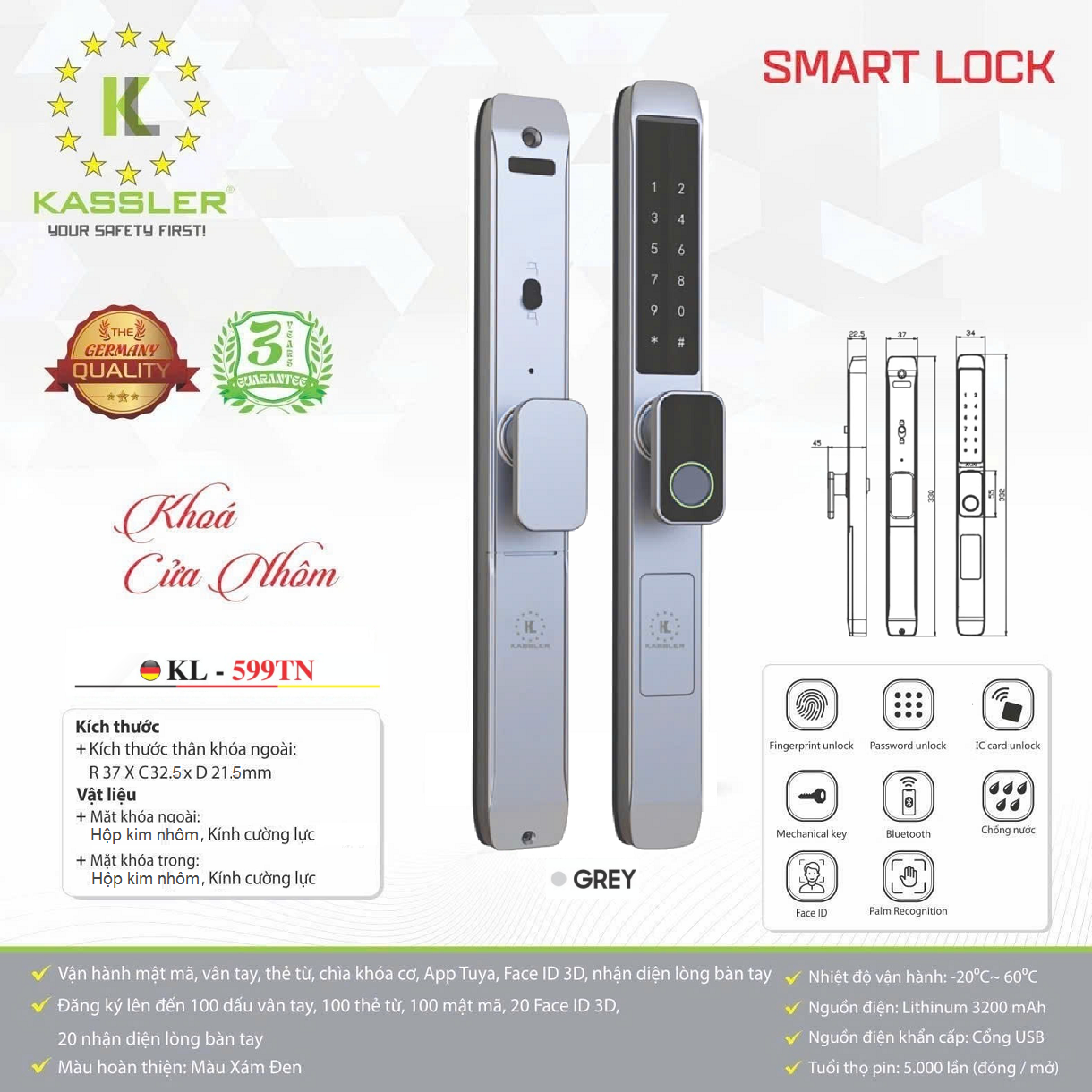 Với những tính năng thông minh và công nghệ hiện đại kể trên, Kassler KL-599TN GREY APP mang đến sự an tâm và tiện nghi tuyệt đối cho người sử dụng. Sản phẩm này xứng đáng là lựa chọn hàng đầu cho ngôi nhà thông minh của bạn.