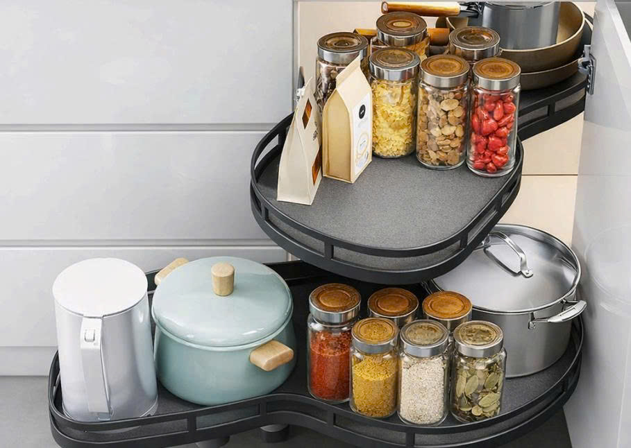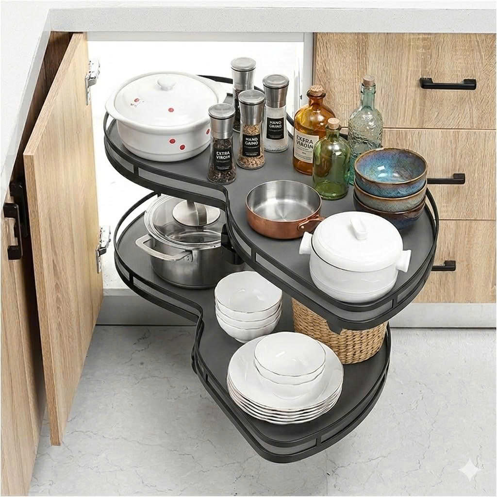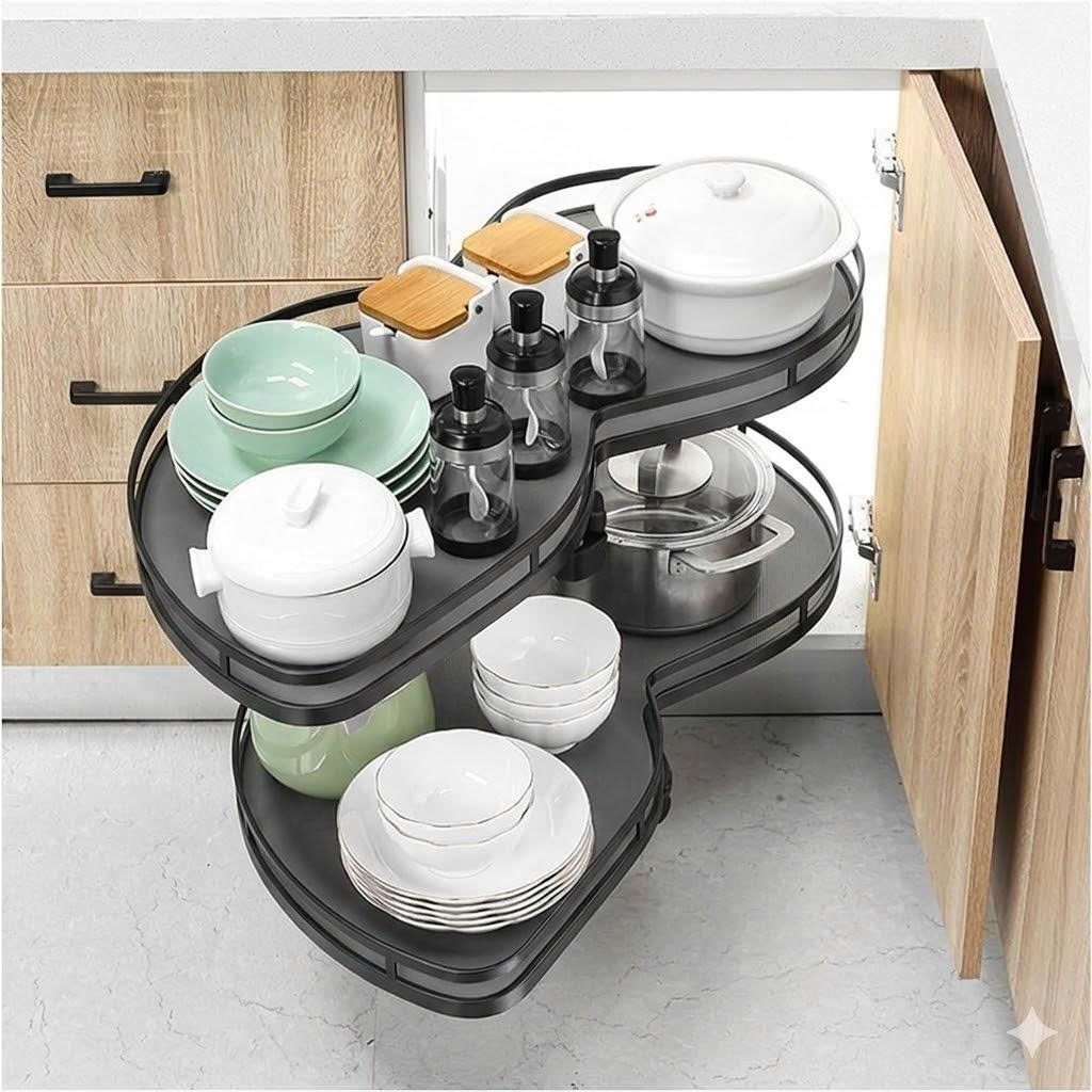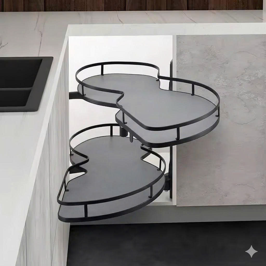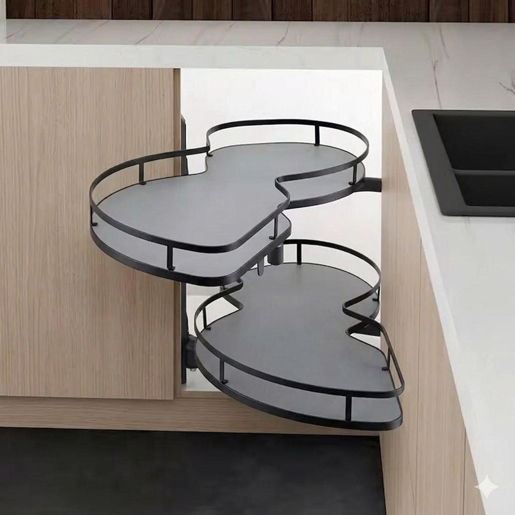 Thiết kế hình lá mở toàn phần: Đường cong hình lá cho phép mâm xoay hoàn toàn ra ngoài khoang tủ. Chị có thể đứng từ trên nhìn xuống và lấy đồ dùng một cách trực diện, không cần cúi sâu hay với tay vào góc tối.