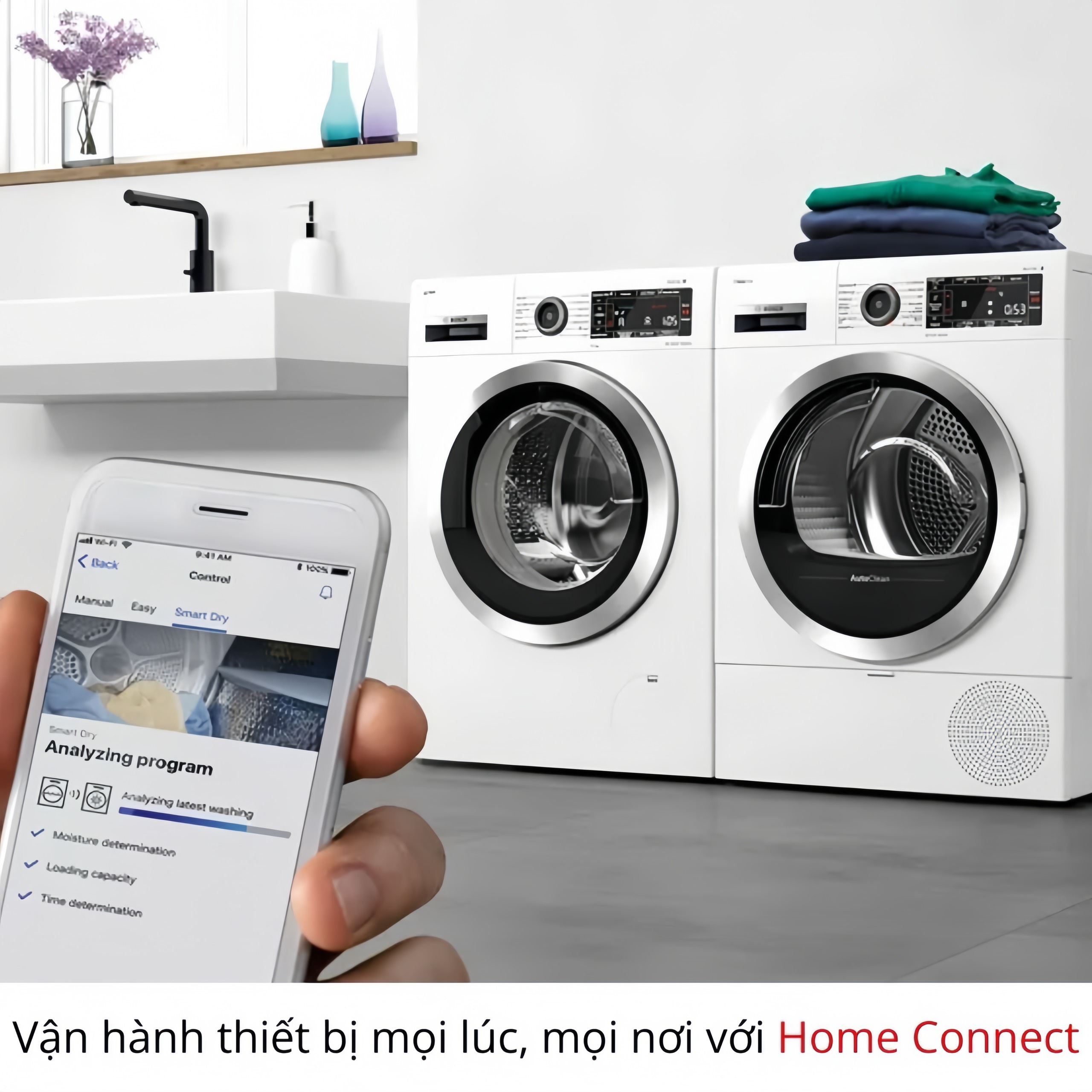 Điều khiển máy giặt từ xa: Người dùng chỉ cần kết nối máy giặt với điện thoại hoặc là máy tính. Sau khi bỏ quần áo vào trong lồng giặt sau đó chỉ cần nhấn nút bắt đầu chương trình giặt từ xa thông qua chức năng Home Connect.