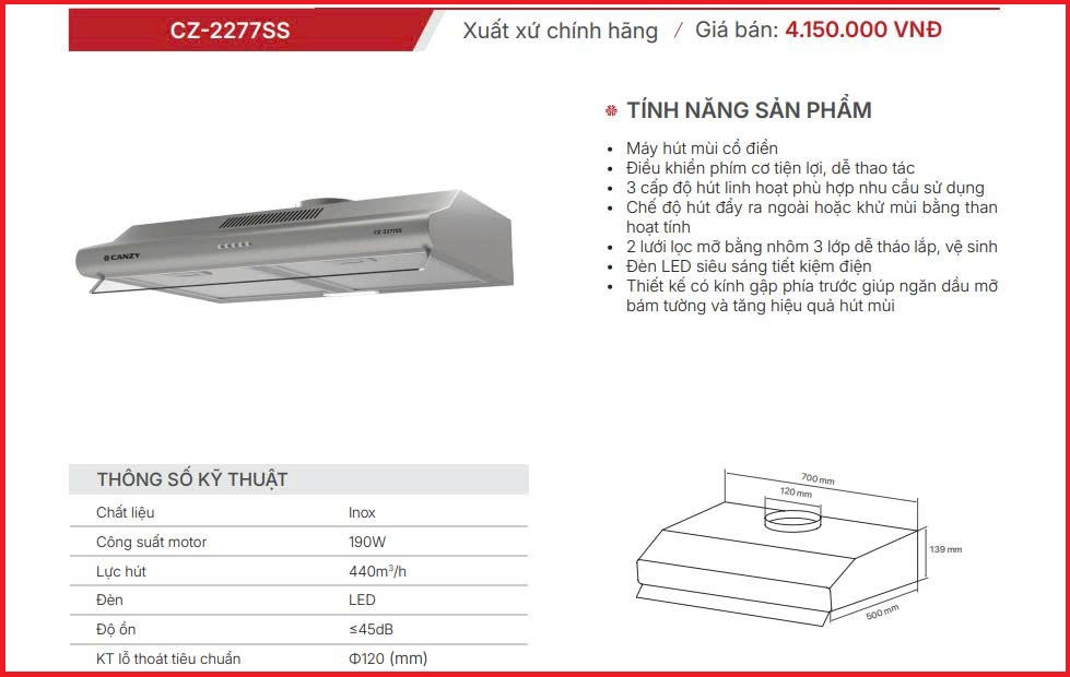 Với thiết kế inox sáng bền đẹp, kích thước nhỏ gọn 700mm, kính gập tiện dụng và nhiều tính năng hỗ trợ nấu nướng, máy hút mùi cổ điển CZ-2277SS là lựa chọn phù hợp cho những gia đình cần một thiết bị hút mùi hiệu quả nhưng vẫn tối ưu chi phí.