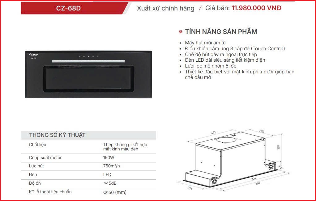 MÁY HÚT MÙI ÂM TRẦN TỦ BẾP | CANZY CZ-68D | 75CM | MÀU ĐEN | THIẾT KẾ SANG TRỌNG | HỆ ĐIỀU KHIỂN CẢM ỨNG SIÊU NHẠY | AN TOÀN, BỀN BỈ VÀ TIẾT KIỆM ĐIỆN NĂNG.