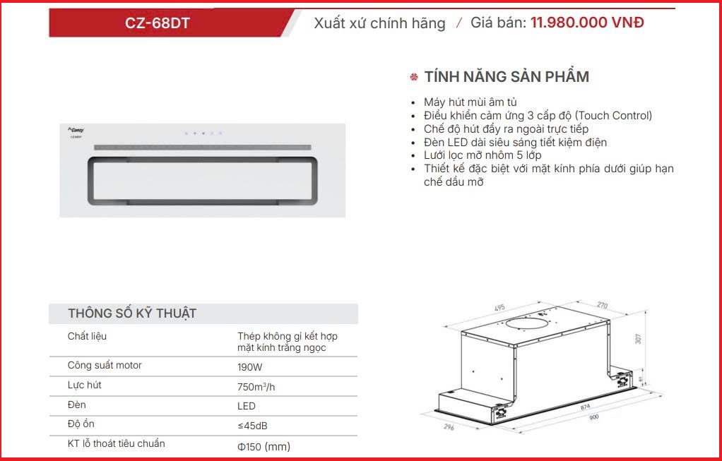 Máy hút mùi âm tủ CZ 68DT là sản phẩm công nghệ tiên tiến, đáp ứng nhu cầu của những người nội trợ hiện đại. Với thiết kế tinh tế và nhiều tính năng vượt trội, máy hút mùi CZ 68DT không chỉ giữ cho không gian bếp của bạn luôn sạch sẽ mà còn tăng thêm phần sang trọng và hiện đại cho ngôi nhà.