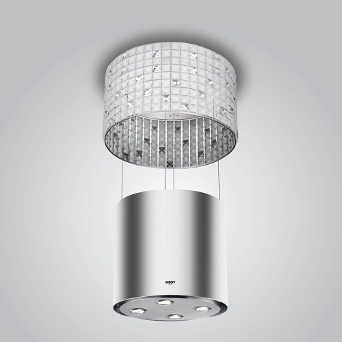Máy hút mùi đảo trang trí treo cáp, hình trụ tròn, chế tạo bán thủ công kết hợp giữa Inox 304 và pha lê trang trí.