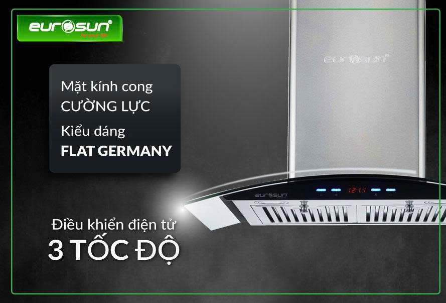 Máy Hút mùi Eurosun EH-70K11E là dòng máy hút mùi gắn tường thiết kế dạng kính cong. Thân máy inox kết hợp với kính màu dày 6.0mm tạo lên vẽ đẹp sang trọng trong không gian bếp. Hút mùi Eurosun EH-70K11E được trang bị động Tuabin Europe Energy A+ lõi đồng, công suất hút mạnh mẽ lên tới 190W giúp loại bỏ mùi thức ăn trong không gian bếp.