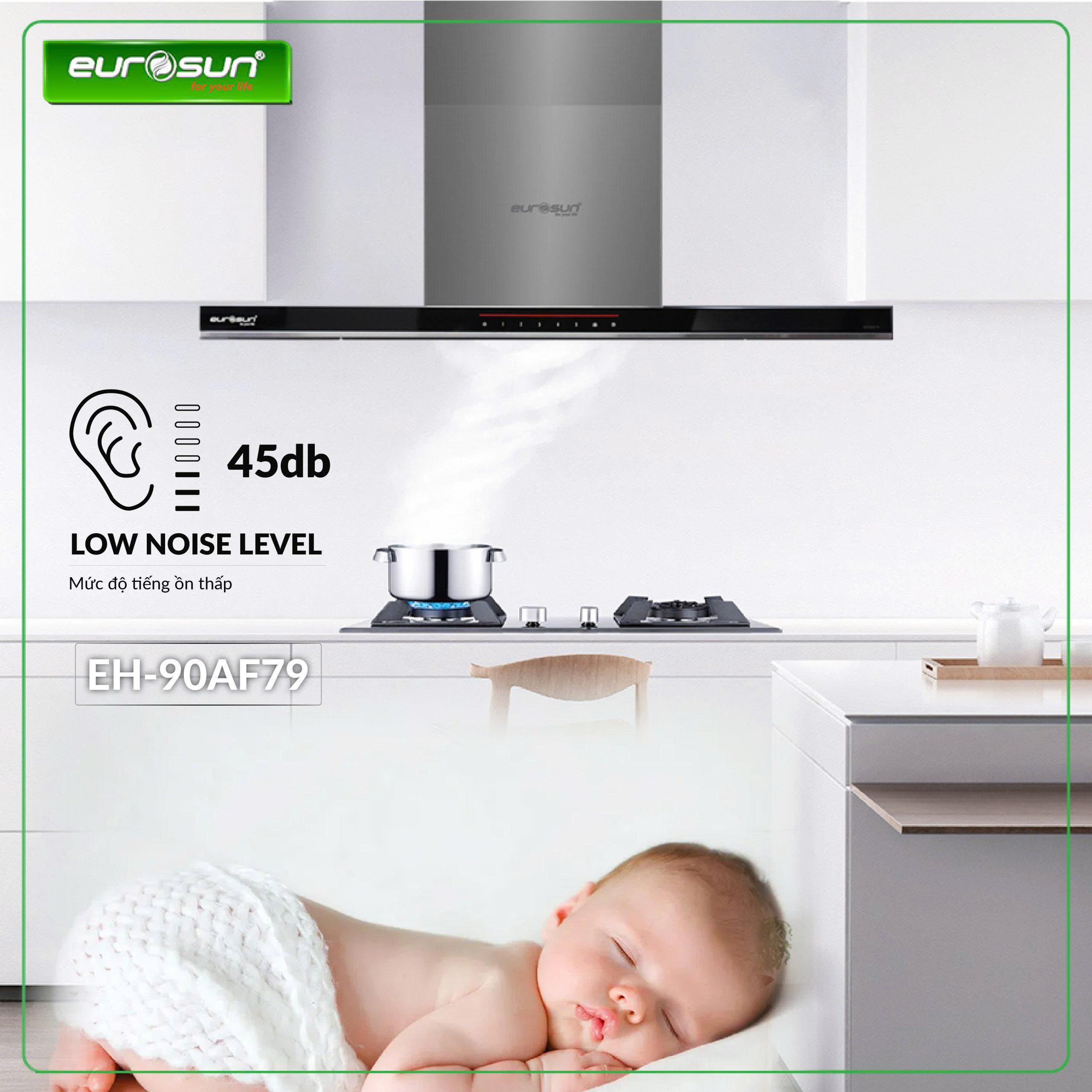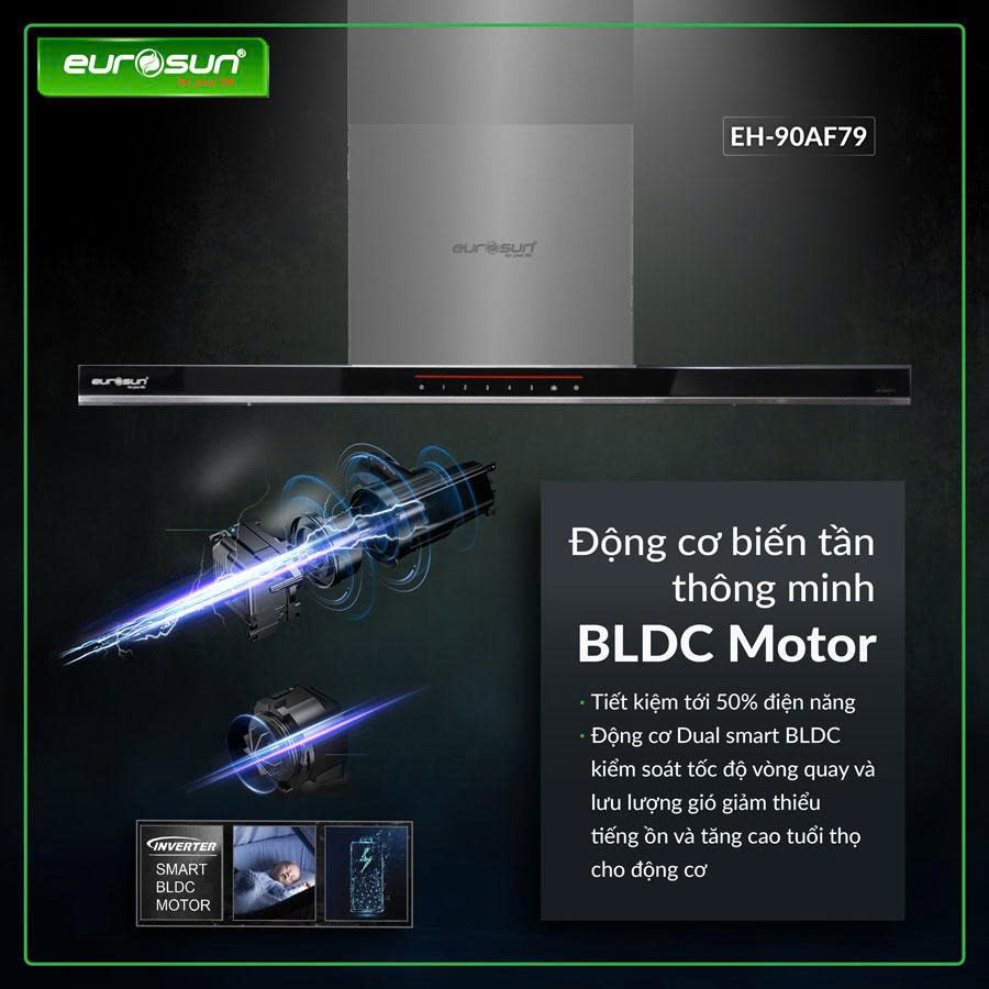 Hút mùi EH-70AF79 à một trong các dòng hút mùi mới nhất của Eurosun. Sản phẩm chất lượng cao cấp hàng đầu khi sử dụng động cơ inverter SMART BLDC ENERGY A+ với độ ồn rất thấp khoảng 45db, công suất động cơ chỉ 90W giúp tiết kiệm trên 50% điện năng tiêu thụ.