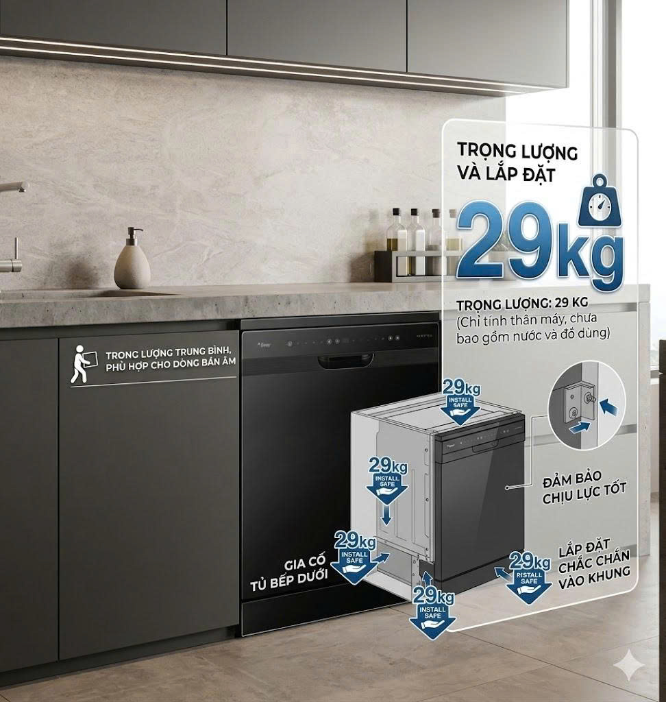 Kiểu dáng độc lập linh hoạt: Bạn hoàn toàn có thể đặt máy đứng độc lập như một điểm nhấn công nghệ, hoặc tháo nắp để lắp âm tủ đồng bộ với hệ thống kệ bếp. Kích thước này cực kỳ phù hợp cho các căn hộ chung cư hoặc nhà phố hiện đại.