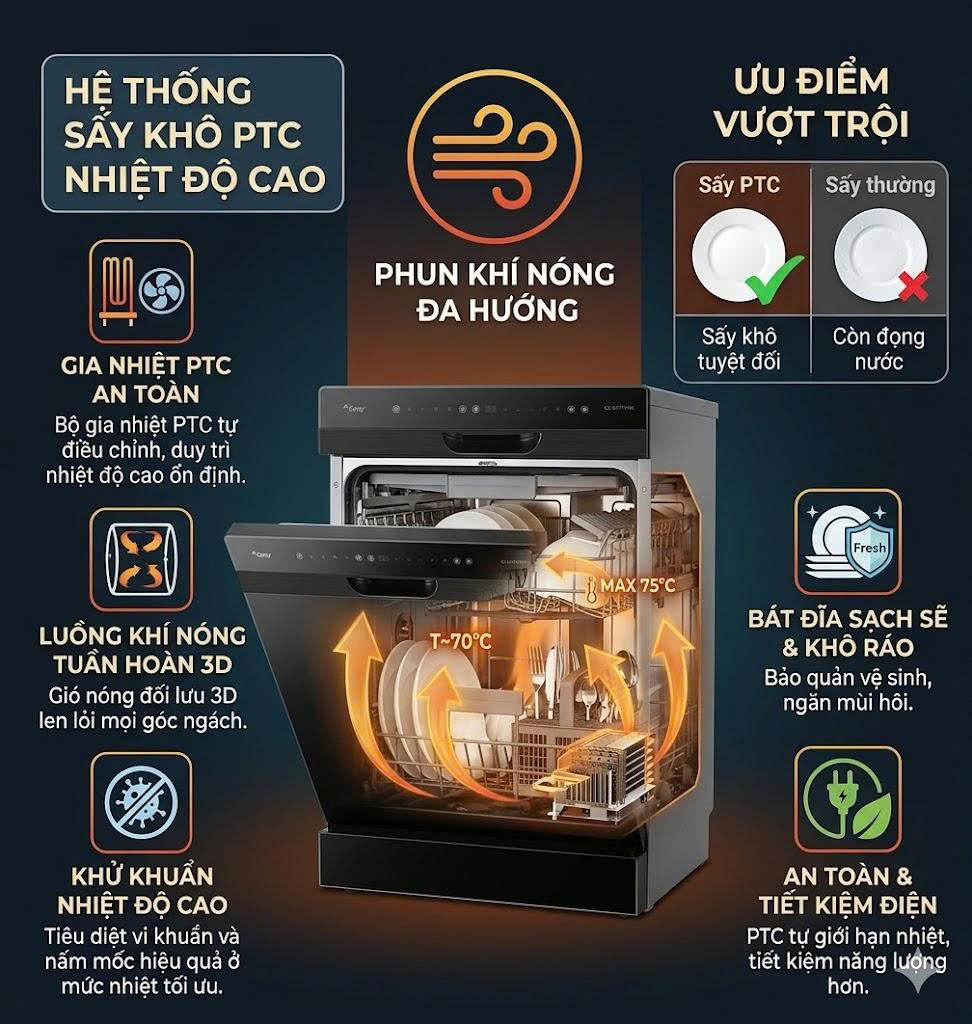 Công nghệ sấy PTC (Positive Temperature Coefficient): Sử dụng thanh nhiệt điện trở thông minh để gia nhiệt luồng khí thổi vào khoang máy. Khác với sấy nhiệt dư truyền thống, sấy PTC giúp bát đĩa khô nhanh hơn, kể cả những vật dụng khó nhằn như đồ nhựa hay đồ gỗ.