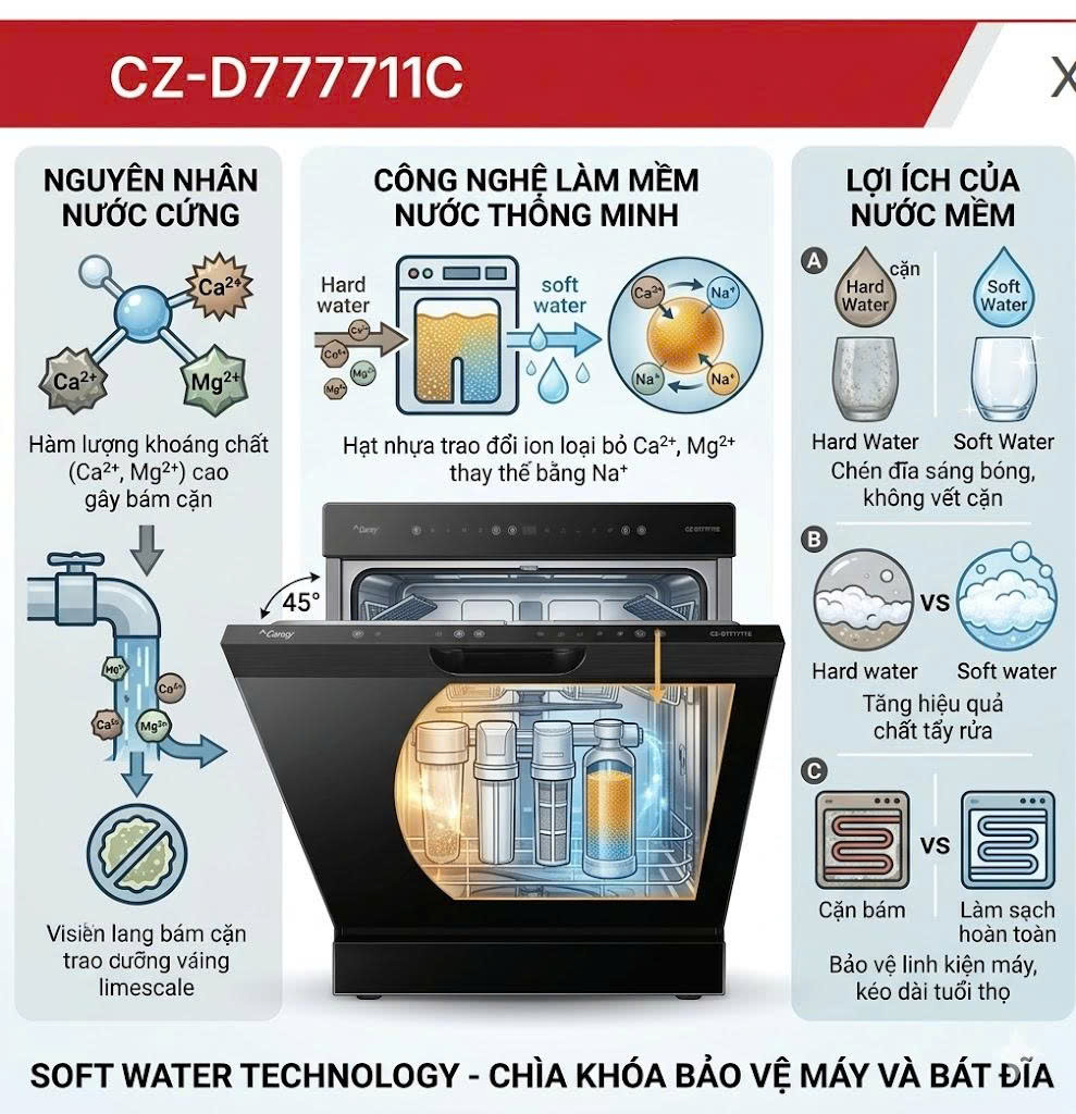 Trong các dòng máy rửa bát cao cấp, việc làm sạch vết bẩn chỉ là điều kiện cần, còn việc bảo vệ bề mặt vật dụng và duy trì tuổi thọ máy mới là điều kiện đủ. Công nghệ Soft Water (Làm mềm nước) trên máy rửa bát Canzy chính là yếu tố tạo nên sự khác biệt đó.