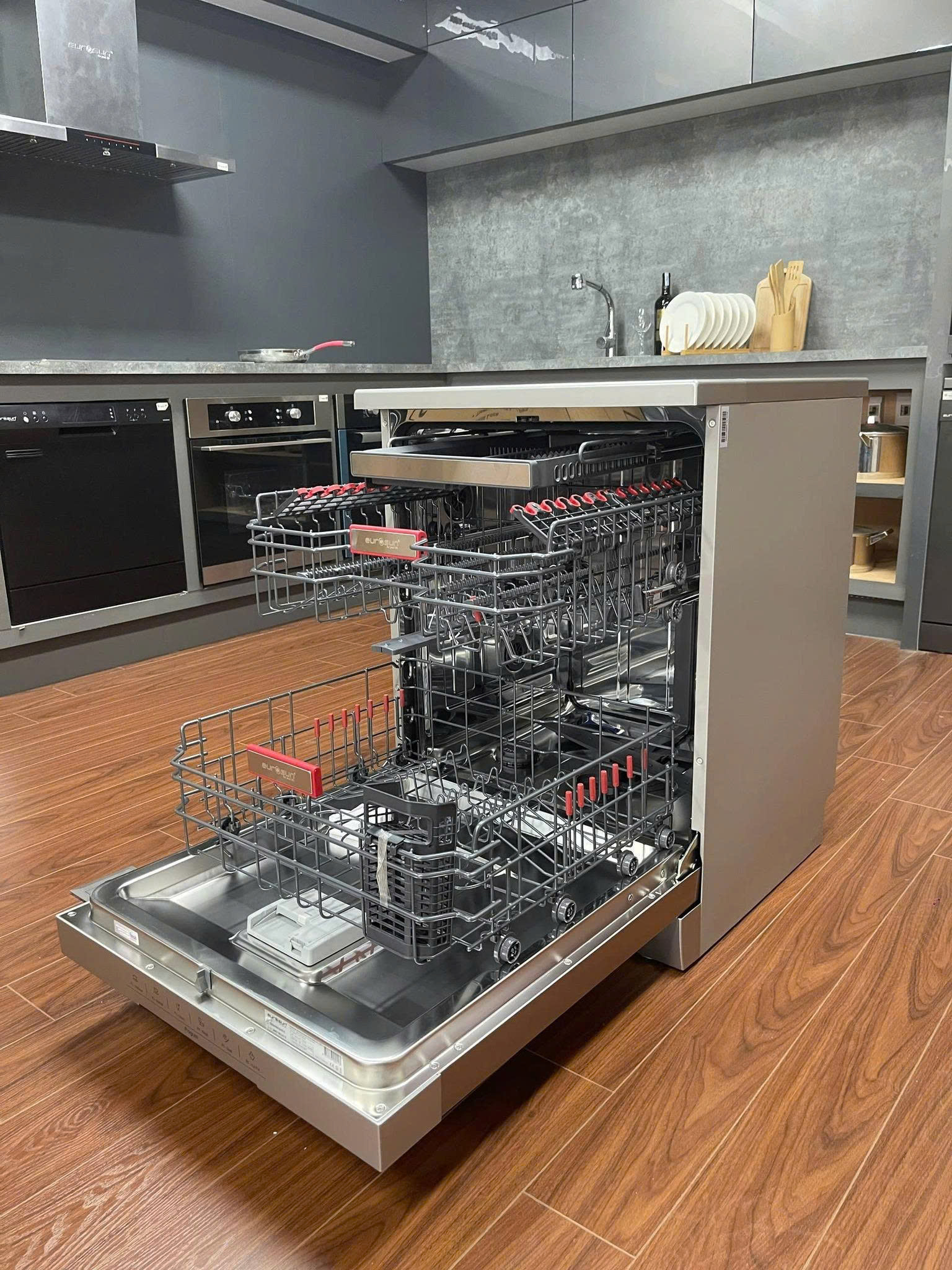Thiết kế bên trong gồm 3 ngăn chứa đồ cơ động và 1 ngăn giỏ để dao kéo hoặc để đũa, dung tích của máy có thể chứa tới 14 bộ bát đĩa. Khay xếp bát đĩa đã được Eurosun nghiên cứu và thiết kế chuyên dụng dành riêng cho thị trường Châu Á chắc chắn và dễ sử dụng. Hệ thống khay rửa (giàn rửa) có thể kéo ra dễ dàng rất thuận tiện cho việc sắp xếp đồ vào máy.