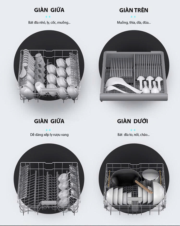 Được trang bị 3 khay chứa đa năng, cơ động + 1 giỏ để đũa, dao kéo. Dung tích chứa tới 16 bộ bát đĩa.