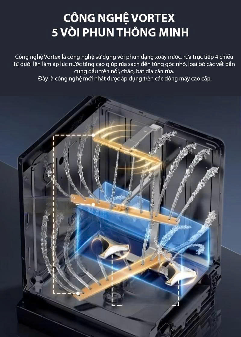Công nghệ Dual Vortex Wash là công nghệ sử dụng vòi phun dạng xoáy nước, rửa trực tiếp 3 chiều từ dưới lên làm áp lực nước tăng cao giúp rửa sạch đến từng góc nhỏ, loại bỏ các vết bẩn cứng đầu trên nồi, chảo, bát đĩa cần rửa. Đây là công nghệ mới nhất được áp dụng trên các dòng máy cao cấp. Hệ thống vòi phun đột phá cho khả năng làm sạch nồi, chảo hiệu quả gấp 3 lần. Các cánh tay phun đều đến từng ngõ ngách của máy giúp rửa sạch, tối ưu thời gian.