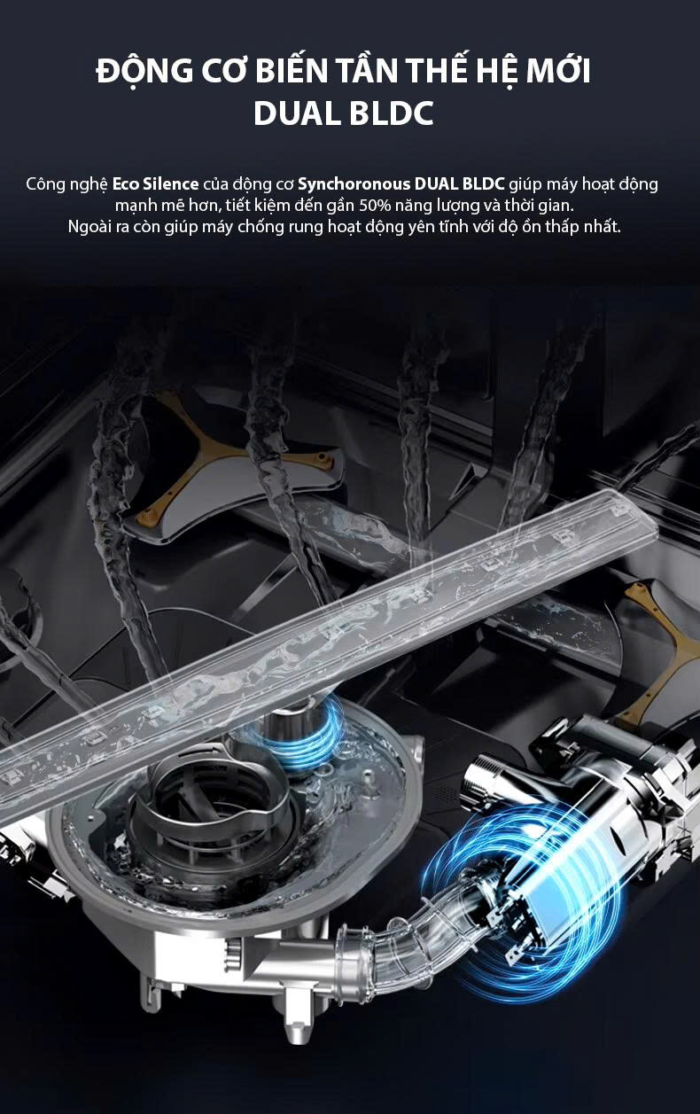 Máy rửa bát Eurosun SMS82EU88B ứng dụng công nghệ Eco Silence của động cơ Synchoronous DUAL BLDC giúp máy hoạt động mạnh mẽ hơn, tiết kiệm đến gần 50% năng lượng và thời gian, ngoài ra còn giúp máy chống rung hoạt động yên tĩnh với độ ồn thấp nhất. Do vậy, máy không tốn điện năng như nhiều người vẫn nghĩ.