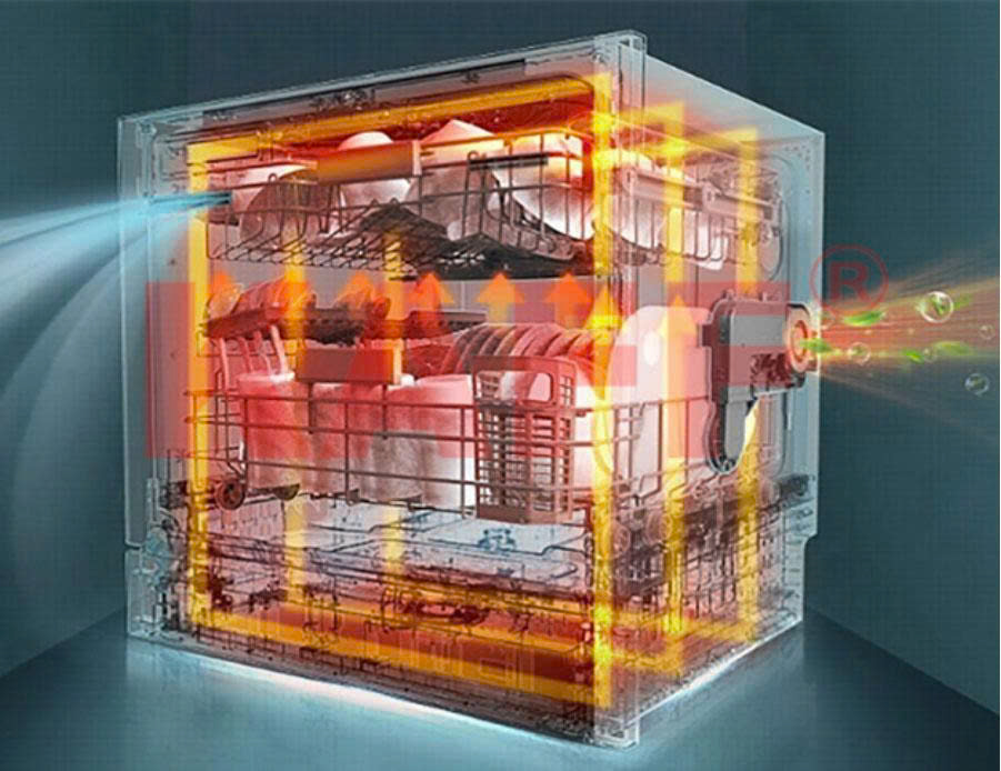 Hệ thống PTC sấy khô khí nóng: Sau khi quá trình rửa chén bát hoàn tất, máy sẽ dẫn không khí tự nhiên bên ngoài thông qua bộ gia nhiệt PTC để tạo thành luồng khí nóng thổi vào khoang máy và nhanh chóng lấy đi hơi ẩm còn tồn lại, giúp cho các bộ đồ ăn được sấy khô hoàn toàn.