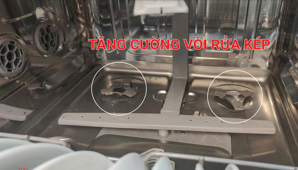 Tăng cường vòi rửa kép (Dual zone wash function) chức năng xả bổ sung để tăng số bước, có thể chọn thêm 1, 2 hoặc thêm 3 lần xả để làm sạch bộ đồ ăn bẩn hiệu quả hơn. Chức năng xả tăng cường chỉ có thể được chọn cho giặt mạnh, giặt thường, giặt mềm thủy tinh và rửa rau củ quả.